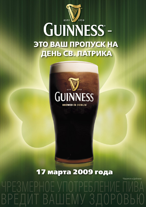 Как и день Святого Патрика, Guinness тесно переплетен с историей и традициями Ирландии. 250 лет тому назад, в 1759 года Артур Гиннесс подписал договор аренды знаменитой пивоварни St. James's Gate сроком на 9000 лет. Сегодня пиво Guinness варится почти в 50 странах, включая Россию, и продается в 150 странах мира. С течением времени Guinness стал легендой, историей успеха и одним из культовых брендов в мире. Для многих любителей хмельного напитка он был и остается образом жизни.