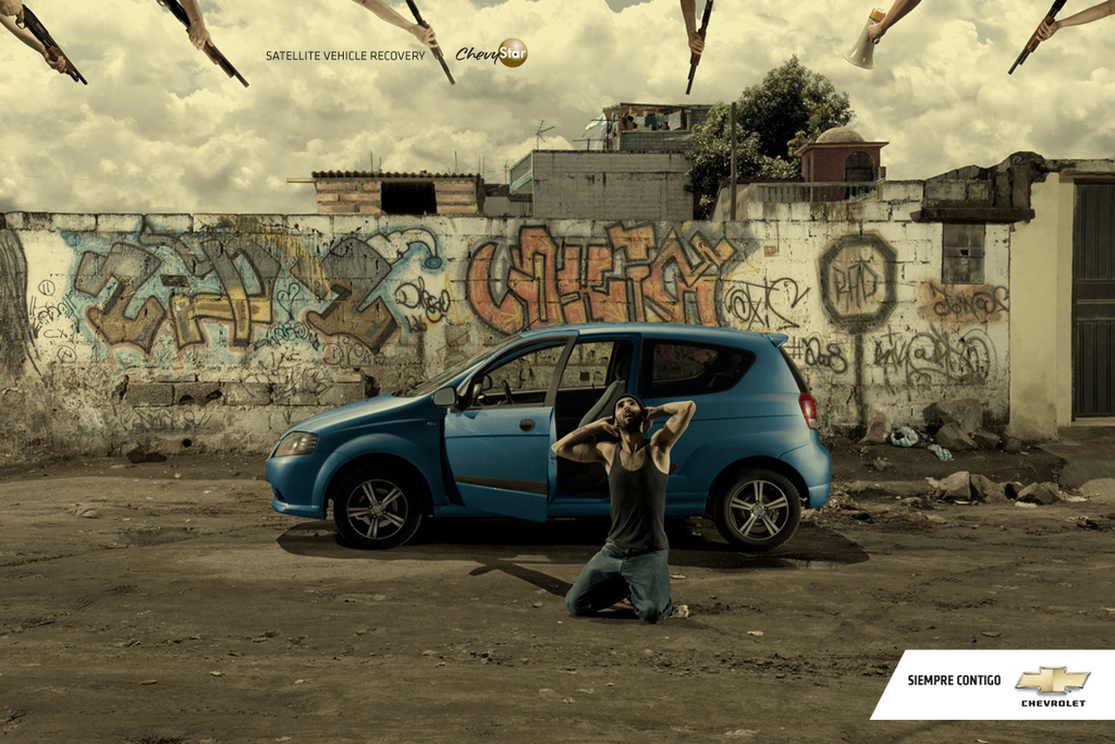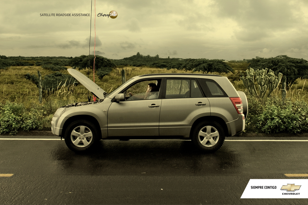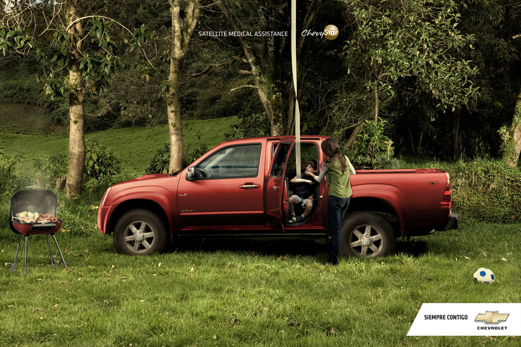 Chevrolet и ChevyStar оказывают "спутниковую" помощьАвтомобильная марка Chevrolet, принадлежащая концерну GM, совместно с эквадорским дилерским центром ChevyStar проводят новую "спутниковую" акцию, в рамках которой рекламное агентство McCann Erickson подготовило эту серию принтов. Дело в том, что в рамках специальной программы владельцам автомобилей Chevrolet предоставляется медицинская помощь, помощь на дороге, а также противоугонная спутниковая система, что наглядно демонстрирует рекламная кампания.Агентство: McCann Erickson, Кито, Эквадор Главный творческий директор: Diego Perdomo Творческий директор: Diego Perdomo Арт-директор: Juan Manuel Larco Копирайтер: Mario Freire Фотограф: Ramiro Salazar |
