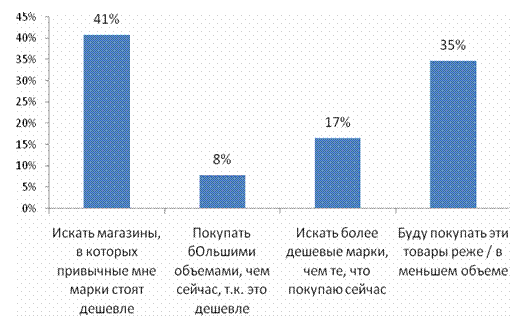 ![]() ![]() Поведение и мотивация потребителей в отношении продуктов питания в период кризисаКомпании «Profi Online Research» опубликовала результаты исследования «Изменения в поведении и мотивации потребителей во время кризиса»[1], которое проводилось в крупнейших российских городах в феврале 2009 года совместно с «Qualitel Data Services». Выяснилось, что основными направлениями экономии на продуктах питания стали: поиск торговых точек, где привычные товары/марки стоят дешевле и сокращение частоты и/или объемов покупок. Стоит отметить, что продукты «первой необходимости» (хлеб, молоко, яйца и др.) эта тенденция практически не затронула. Выяснилось, что, пытаясь экономить, потребители используют различные способы. Однако большинство не видит выгоды или не имеет возможности покупать товары большими объемами – к такому способу прибегают лишь 8% участников исследования (см. рис.№1).