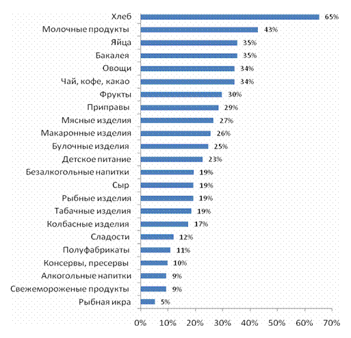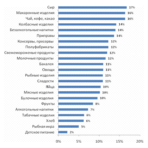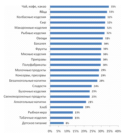 Рис.№3: В отношении каких из категорий Вы будете применять такой способ экономии, как приобретение товаров реже/в меньшем объеме, если кризис коснется Вас (или уже коснулся)? Также в кризис люди готовы отказаться от приобретения дорогих марок продуктов. Этот факт в первую очередь отразится на повышении спроса на недорогие марки сыров, чая и кофе, а также макаронных изделий. Каждый десятый участник опроса отмечал, что также начал/планирует покупать более дешевое мясо, булочные изделия и яйца. Наиболее чувствительными к марке оказались покупатели фруктов, алкоголя, табака и детского питания (см. рис.№4).