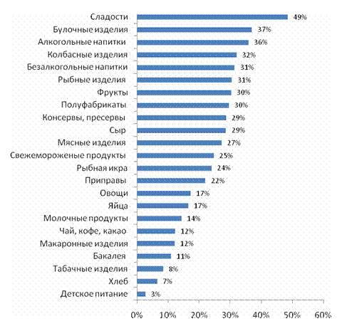 Рис.№2: В отношении каких из категорий Вы будете применять такой способ экономии, как поиск магазинов, где привычные товары стоят дешевле, если кризис коснется Вас (или уже коснулся)? Одним из широко используемых способов экономии стало снижение частоты и объемов покупок. В первую очередь, это коснулось сладостей (объемы и частоту их потребления сократили/планируют сократить почти половина опрошенных – 49%), второе и третьи места заняли булочные изделия (37%) и алкоголь (36%). Около трети респондентов отметили, что стараются меньше покупать колбасу, рыбу и безалкогольные напитки (соки, газировка, минеральная вода и др.) (см. рис.№3).