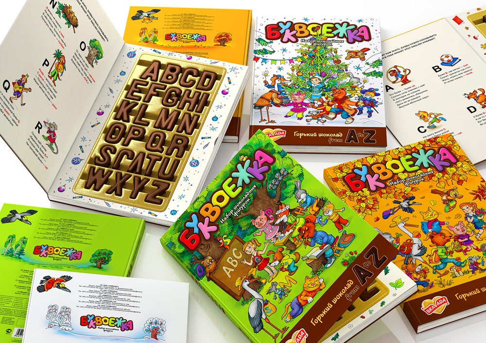 Аким Мельник заговорил на языке шоколадаШоколадный алфавит "БУКВОЕЖКА"По заказу "Сименон" Студия Акима Мельника разработала общую концепцию торговой марки "Буквоежка", ряд персонажей и тематические иллюстрации для каждой из упаковок. Серия из шести упаковок условно разделена на две группы: горький и молочный шоколад. В каждой группе три вида обложек: "Лесная школа", "Первое сентября" и "Новый год". На оборотной стороне каждой из них 4-5 букв с четверостишием и иллюстрациями. |