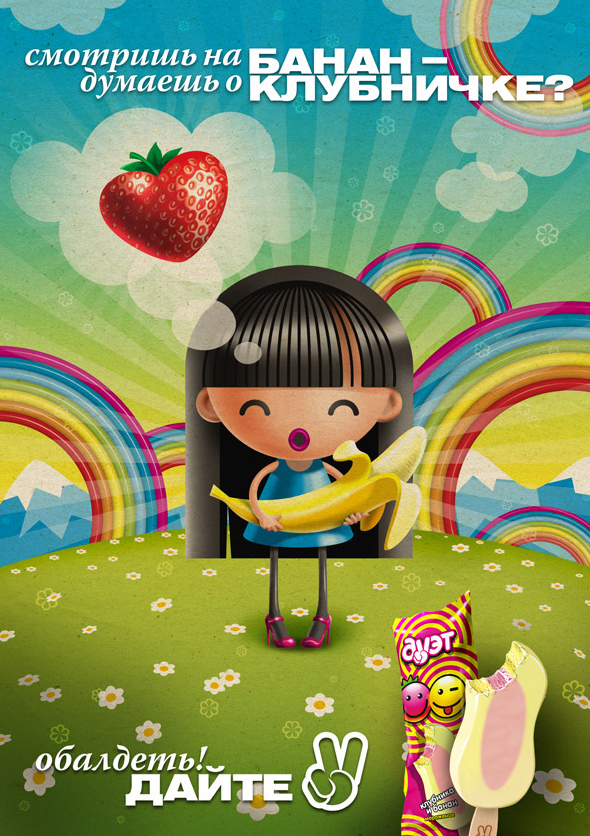 Новая линейка мороженого "Дуэт" - это двойная польза и удовольствие: банан и клубника или ваниль и шоколад. Поэтому и принты, сделанные в ее поддержку, тоже с двойным дном и смыслом.