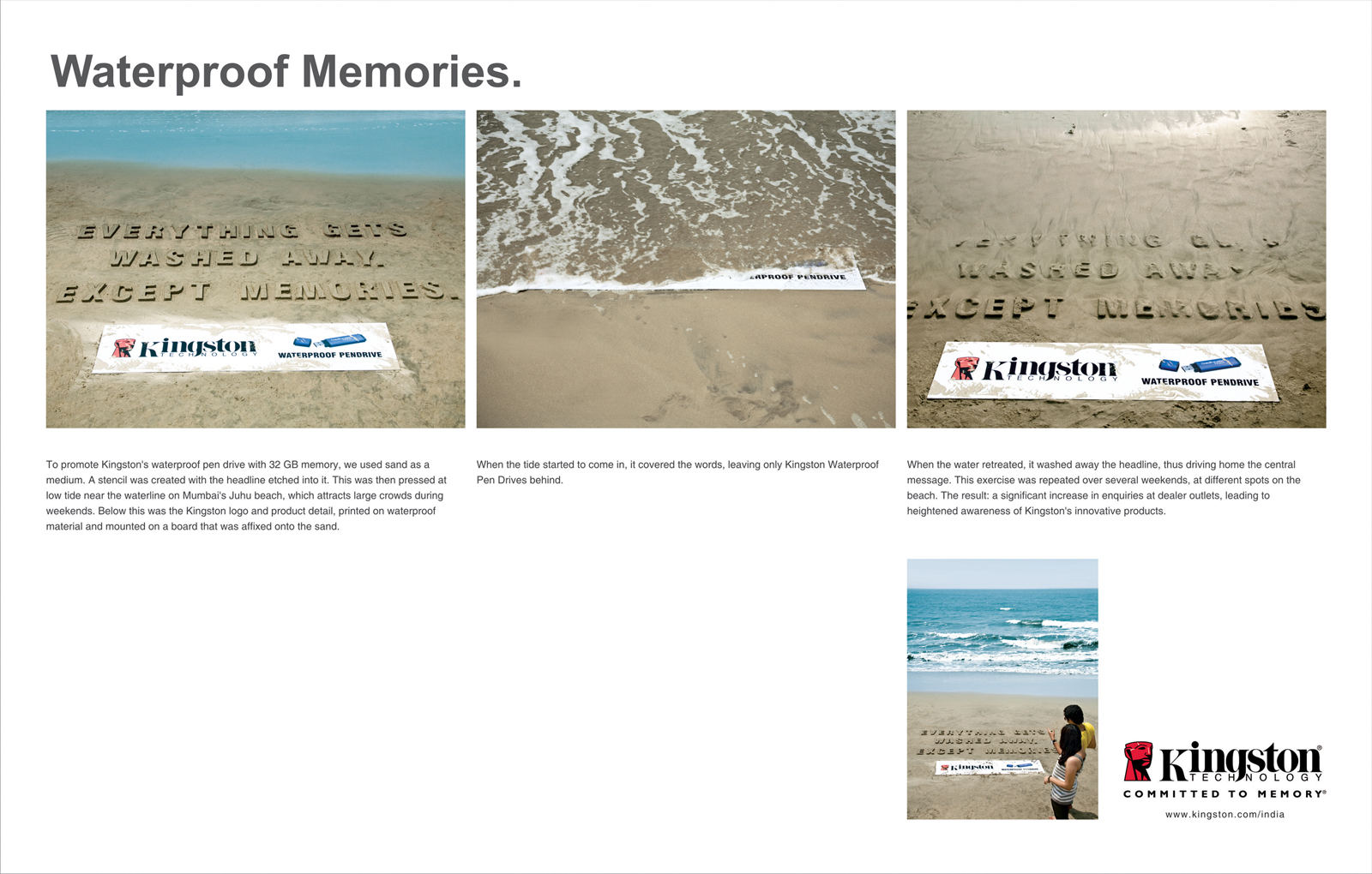 Индийский пляж помог прорекламировать KingstonЖуху - один из самых крупных и популярных пляжей индийского штата Махараштра, расположенный в 18 километрах от центра Мумбай. Именно этот пляж на протяжении нескольких выходных в качестве рекламной площадки решило использовать индийское агентство Six Inches Communication. Чтобы показать основное преимущество флеш-накопителя Kingston Waterproof 32Gb, креаторы при помощи песка и доски с сообщением показали, что со временем все "смывается", но только не воспоминания и данные, если они записаны на объемной и влагозащитной флешке.Слоган: "Все смывается, кроме воспоминаний/памяти." Агентство: Six Inches Communication, Мумбай, Индия Творческий директор: Pravin Shah, Sanjay S Арт-директор: Rutul Mistry Копирайтер: Richa Agarwal Фотограф: Nilesh Achrekar Другое: Sachin Rane |