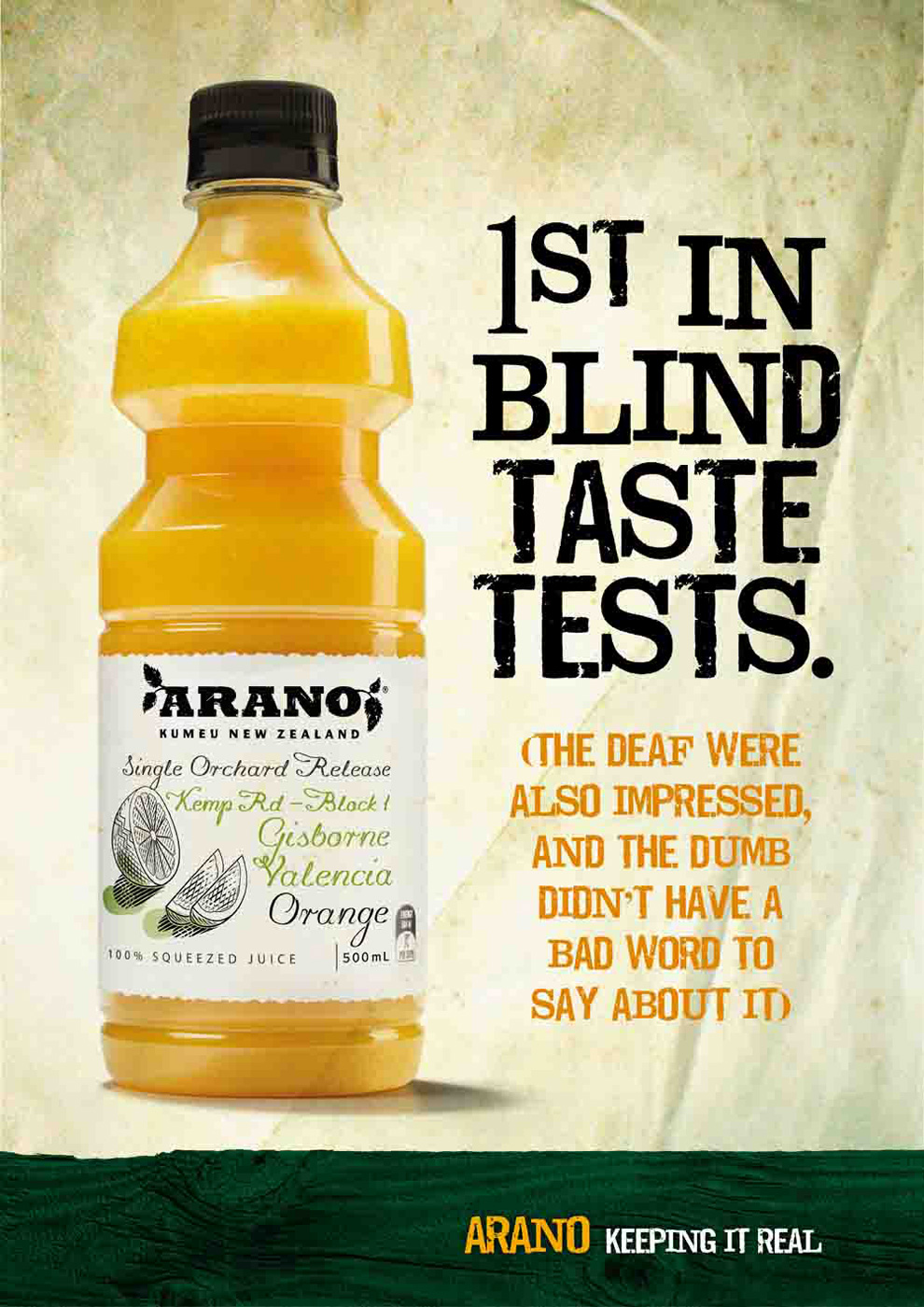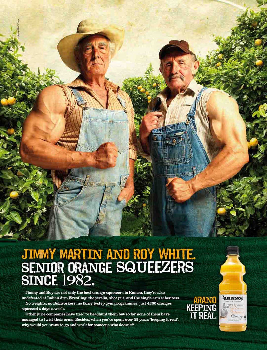 Arano со вкусом настоящего апельсинаКомпания Arano берет свое начало в далеком 1960 году. Все начиналось с небольшой плантации недалеко от Гисборна. Первый свой 100% выдавленный сок компания предоставила на суд потребителя в 1982 году, с тех пор Arano заслужило репутацию компании, предоставляющей самый вкусный и свежий сок на рынке. Рекламная кампания от агентства Zephyr WPD, знакомит потребителя не только с удивительными работниками Arano, Джимми Мартином и Роем Вайтом, которые за долгие годы давки апельсинов так натренировались, что смогли стать чемпионами по арм-рестлингу, но и рассказывает об удивительных потребительских свойствах продукта.Оставляя настоящим Агентство: Zephyr WPD, Auckland, Australia Креативные директора: Warwick Delmonte, Quentin Pfiszter Арт директор: Quentin Pfiszter Копирайтер: Warwick Delmonte |