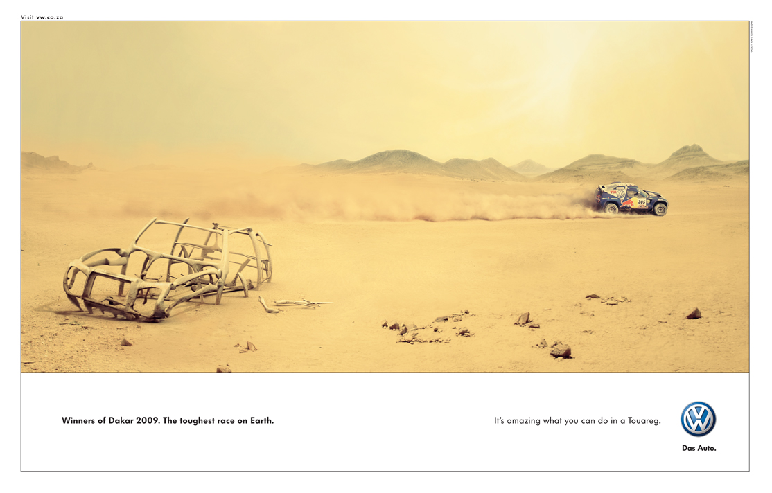 Volkswagen хвастается победой в Ралли Дакар 2009Этот рекламный постер был создан африканскими креаторами из РА Ogilvy Cape Town в честь победы Volkswagen Taureg на величайшем 30-ом юбилейном ралли-марафоне Дакар 2009, который в этом году прошел на территории Южной Америки (Аргентина и Чили). В этой сложнейшей гонке в зачёте автомобилей создания немецкого концерна заняли первое и второе место, показав прекрасные результаты. К слову, стоит отметить, что участникам пришлось пересечь самую сухую пустыню Земли Атакама, которая и была избрана в качестве места действия для принта.Слоган: "Победители Дакар 2009. Сложнейшей гонки на Земле. Удивительно, на что ты способен, сидя в Taureg." Агентство: Ogilvy Cape Town, ЮАР Главный творческий директор: Chris Gotz Творческий директор: Gordon Ray Помощник творческого директора / Копирайтер: Jacques Massardo Глава творческой группы / Арт-директор: Gareth McPherson Арт-директор: Matthew Pullen Копирайтер: Craig Ross |