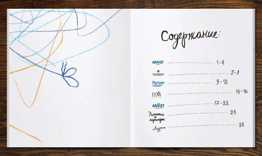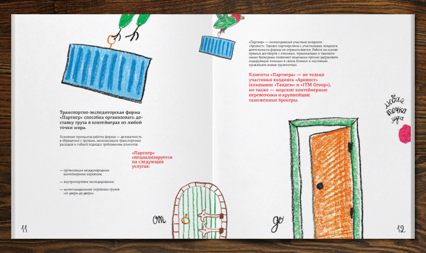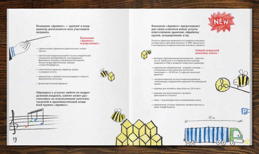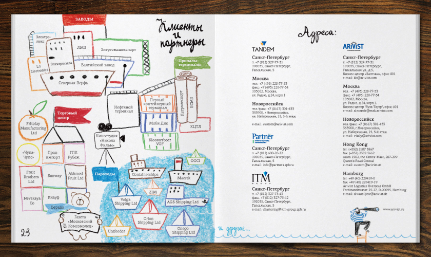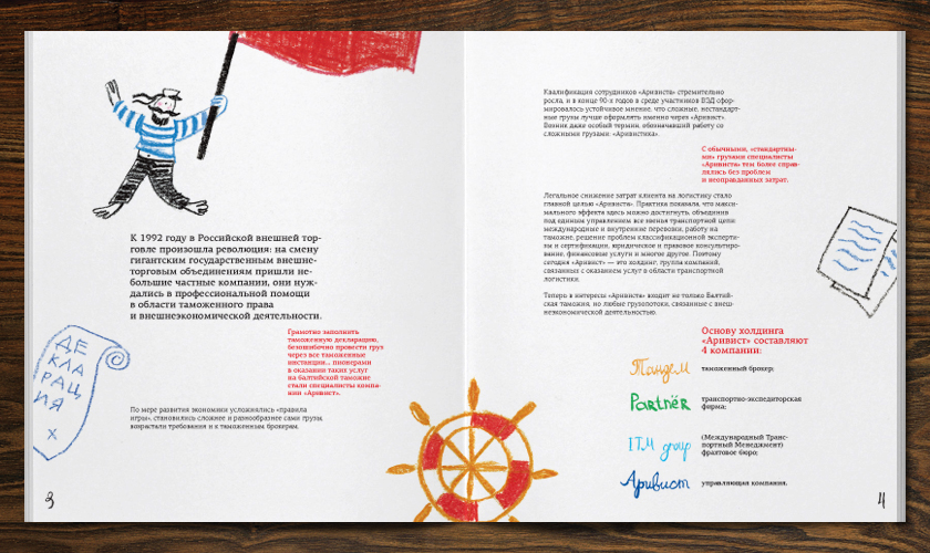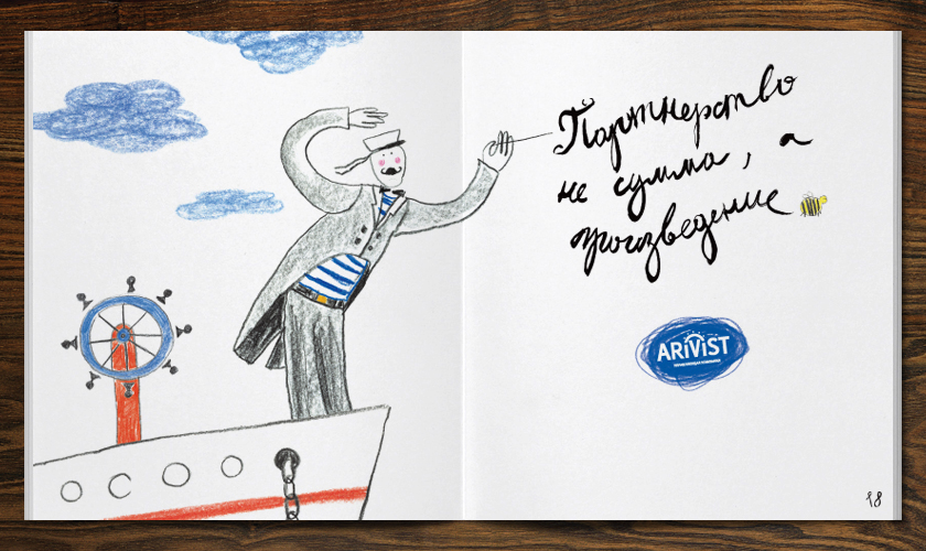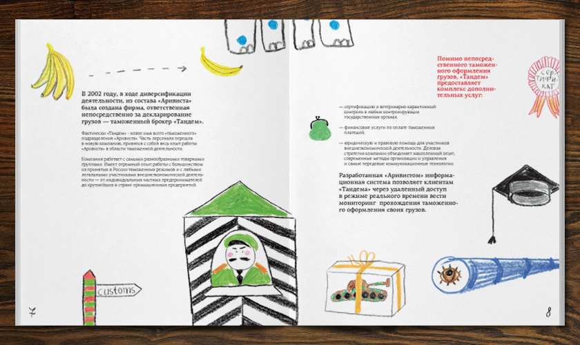 Наивный "Иллан"Рекламная группа "Иллан" завершила работы по оформлению корпоративного буклета для группы компаний "Аривист" - оператор, работающий в области таможенной и транспортной логистики.Основа дизайн-концепции буклета - иллюстрации, решенные в наивной и непосредственной графической манере. Участие этого приема в концепции издания обусловлено важными качественными свойствами в коммуникации Заказчика - дружескими отношениями со своими клиентами и нестандартным подходом в решении бизнес-задач. Буклет издан на двух языках, на русском и английском. Рабочая группа: Креативный директор: Владимир Федосеев Арт-директор: Владимир Федосеев Дизайнер: Арина Юшкевич Иллюстратор: Арина Юшкевич ![]() |