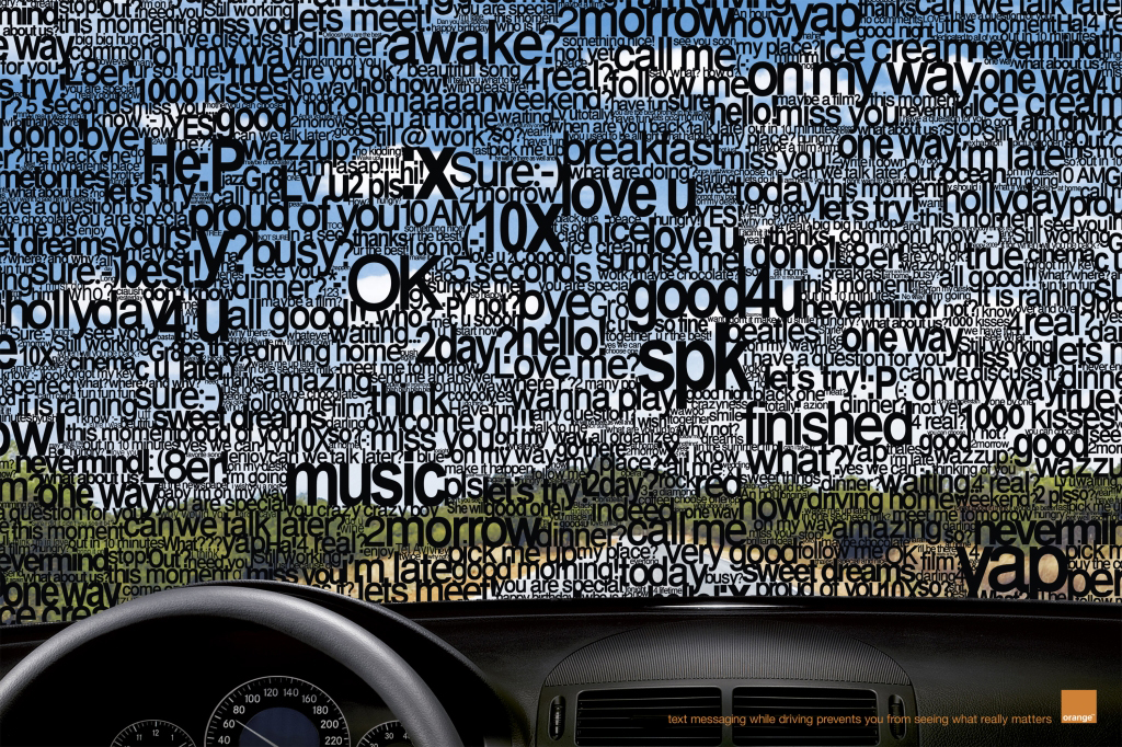 SMSки вместо лобового стекла от OrangeЭтот социально направленный принт, подготовленный израильским рекламным агентством Shalmor Avnon Amichay/ Y&R Tel-Aviv для крупного международного оператора сотовой связи, а также интернет-провайдера Orange. Не секрет, что многие водители во время поездки в автомобиле занимаются чем-то еще помимо самого процесса управления машиной, именно поэтому Orange прежупреждает: «Набор текстового сообщения во время управления мешает вам видеть то, что действительно важно». Агентство: Shalmor Avnon Amichay/ Y&R Tel-Aviv, Израиль |