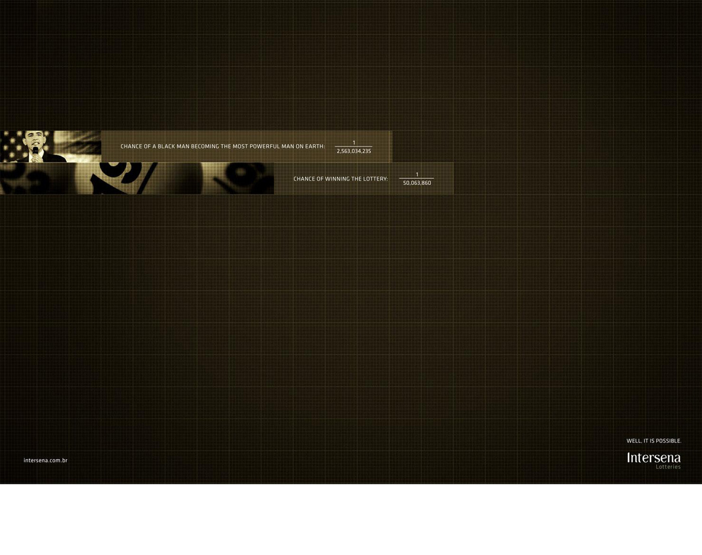 Теория вероятностей от лотереи IntersenaЧтобы рассказать о том, что выиграть в лотерею все-таки возможно, креаторы из бразильского РА DDB Brasil решили привести несколько примеров. Первая ситуация касается нового президента США: тот шанс, что черный человек станет самым могущественным человеком на земле всего лишь 1 к 2 563 034 235. Другой пример: завоевать золото на 14-ых Олимпийских Играх может лишь 1 человек из 5 498 076 003. Ну а выиграть в лотерею Intersena может каждый 50 063 860 человек. Судите сами - шанс есть!Агентство: DDB Brasil, Сан-Паулу, Бразилия Творческий директор: Marcelo Reis, Guilherme Jahara, Rodolfo Sampaio, Julio Andery, Sergio Valente Копирайтер: Adriano Matos Арт-директор: Rodrigo Tortima, Tiago Freitas |