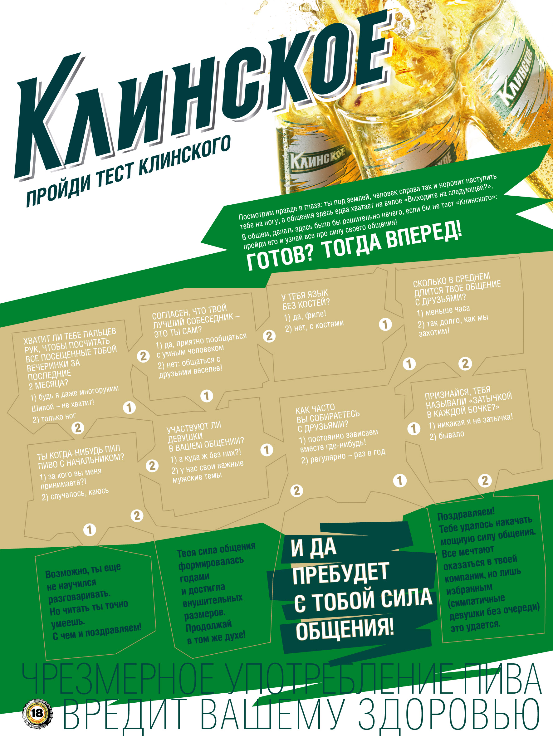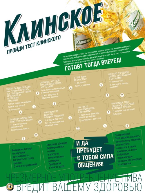 Да пребудет с вами сила КлинскогоБренд "Клинское" запускает новую имиджевую кампанию со слоганом "Клинское Светлое. Сила - в общении!"Сила и непринужденность общения - говорит Клинское в коммуникации - это то, что помогает любому из нас отвлечься от ежедневных забот и проблем. Ведь, с друзьями, как известно, любая проблема кажется легче. А с отличным вкусом Клинского Светлого открытое и полное общение - обеспечено! И если вы уже давно пришли к выводу, что "работа - жесть" и "веры нет" - в кампании с друзьями легко взглянуть на проблемы по-другому. И вот уже "работа есть", а вместо Веры всегда найдется Настя или Марина. Кампания Клинского продлится до середины апреля. В медиа-микс кампании входят: телевизионный и радио ролики, макеты наружной рекламы, в том числе метро-стикеры, баннеры в Интернет. "Вместе с нашими потребителями мы верим в ценность открытого дружеского общения и искренних эмоций и раскрываем важность этого в новой интегрированной рекламной компании со слоганом "Клинское - Сила в Общении". Мы так же надеемся, что успех кампании позволит укрепить позиции Клинского как бренда №2 в России", - отметила менеджер группы брендов Вера Мошкина, комментируя запуск новой имиджевой кампании. Состав творческой группы: Сан ИнБев Вера Мошкина, Group Brand manager Екатерина Трофимова, Brand manager Lowe Adventa Павел Мордюков, Executive Creative officer Сергей Дианшин, Creative Group head Виктор Жижин, Art-director Алексей Лаврухин, Copywriter Татьяна Сергеева, Group Account director Владлена Обухова, Account manager |