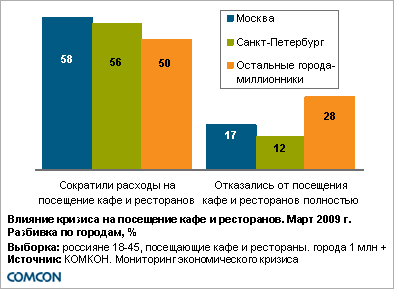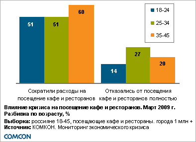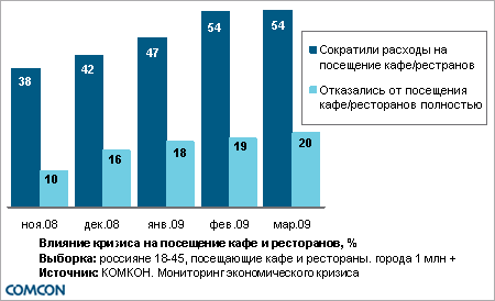 Россияне экономят на посещении кафе и ресторанов из-за кризисаКризис вынуждает россиян экономить на походах в кафе и рестораны либо полностью отказывать себе в этом удовольствии. Такая тенденция подтверждается результатами мартовской волны Мониторинга экономического кризиса компании КОМКОН.Если в ноябре 2008 г. эту статью расхода в своих семейных бюджетах сократили 38% жителей городов-миллионников, посещающих кафе и рестораны, то в феврале и марте аналогичный показатель вырос до 54%. Доля тех, кто полностью отказался от посещения кафе и ресторанов составляет 20% по состоянию на март 2009. За истекшие пять месяцев с момента получения первых данных Мониторинга это значение увеличилось вдвое. ![]() В региональных городах-миллионниках тенденция отказа от посещения ресторанов и кафе проявляет себя наиболее ярко. Здесь доля респондентов, переставших питаться вне дома, составила 28%, что в 2,3 раза больше показателя по Санкт-Петербургу и в 1,6 раза - показателя по Москве. ![]() Анализ ответов респондентов по возрастным группам показывает, что наибольшая доля отказов от посещения ресторанов и кафе приходится на опрошенных 25-34 лет (27%). В значительно меньшей степени готовы отказать себе в этом удовольствии респонденты в возрасте 18-24 лет (14%). Самая высокая доля сокращений расходов на посещение кафе и ресторанов приходится на возрастную группу 35-45 лет и составляет 60%. ![]() Мониторинг экономического кризиса Ежемесячный мониторинг экономического кризиса проводится с ноября 2008 г. Исследование позволяет оценить изменение поведения потребителей в условиях спада и помогает компаниям выбрать оптимальную линию "маркетингового поведения" в сложившихся условиях. В каждой волне опрашивается 1300 респондентов. Подробнее - по ссылке http://www.comcon-2.com/default.asp?artID=1977 |