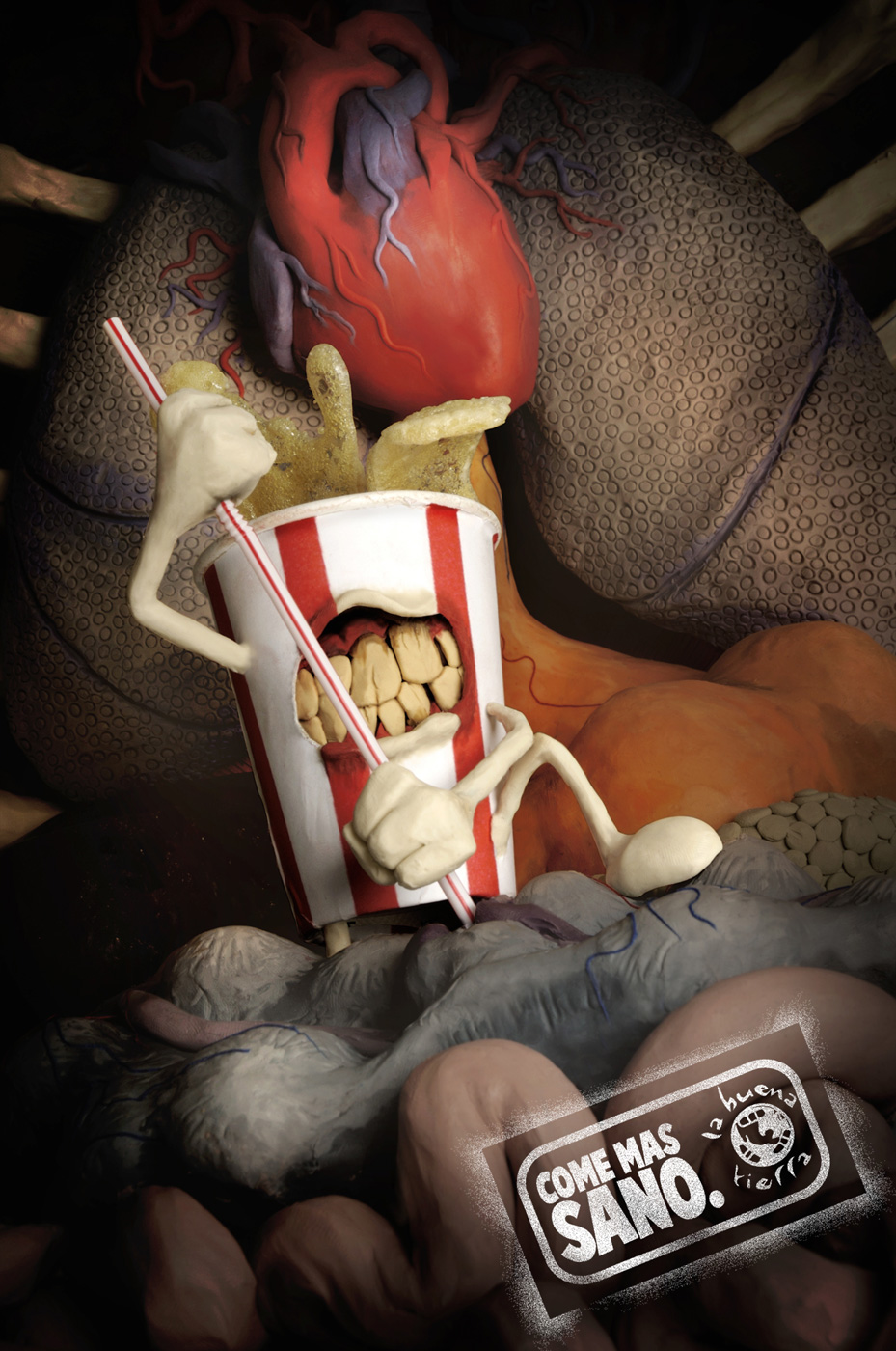 La Buena Tierra борется с фастфудомНевозможно отрицать тот факт, что рацион человека оказывает непосредственное воздействие на его здоровье и долголетие. Ресторан здоровой, экологически чистой пищи La Buena Tierra решил помочь общественности ступить на путь здоровья и долголетия и с помощью агентства Z Mexico, выпустил кампанию, которая приглашает посетить La Buena Tierra и начать питаться правильно. В качестве аргументации ресторан визуализирует вред, который наносит организму фастфуд.Кушайте более здоровую пищу Агентство: Z Mexico Креативные директора: Jose Arce, Fernando Carrera Иллюстратор: Fernando Carrera Фотограф: Gustavo Due?as |