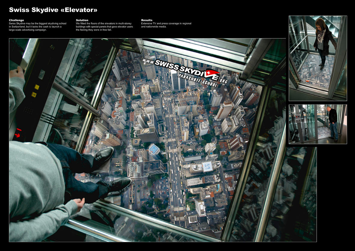 Swiss Skydive заставило людей почувствовать свободное падениеНеобычная рекламная кампания была разработана агентством Wirz/BBDO для Swiss Skydive, самой большой школы парашютного спорта в Швейцарии. Креаторы предложили разместить на полу лифтов в торговых центрах специальные панели, благодаря которым человек, зашедший в лифт, должен был ощутить нечто сродни чувству свободного падения. Результатом акции стал большой отклик в местных и национальных СМИ.Агентство: Wirz/BBDO, Швейцария Творческий директор: Matthias Freuler Арт-директор: Kim Sokola, Rahel Boesinger |