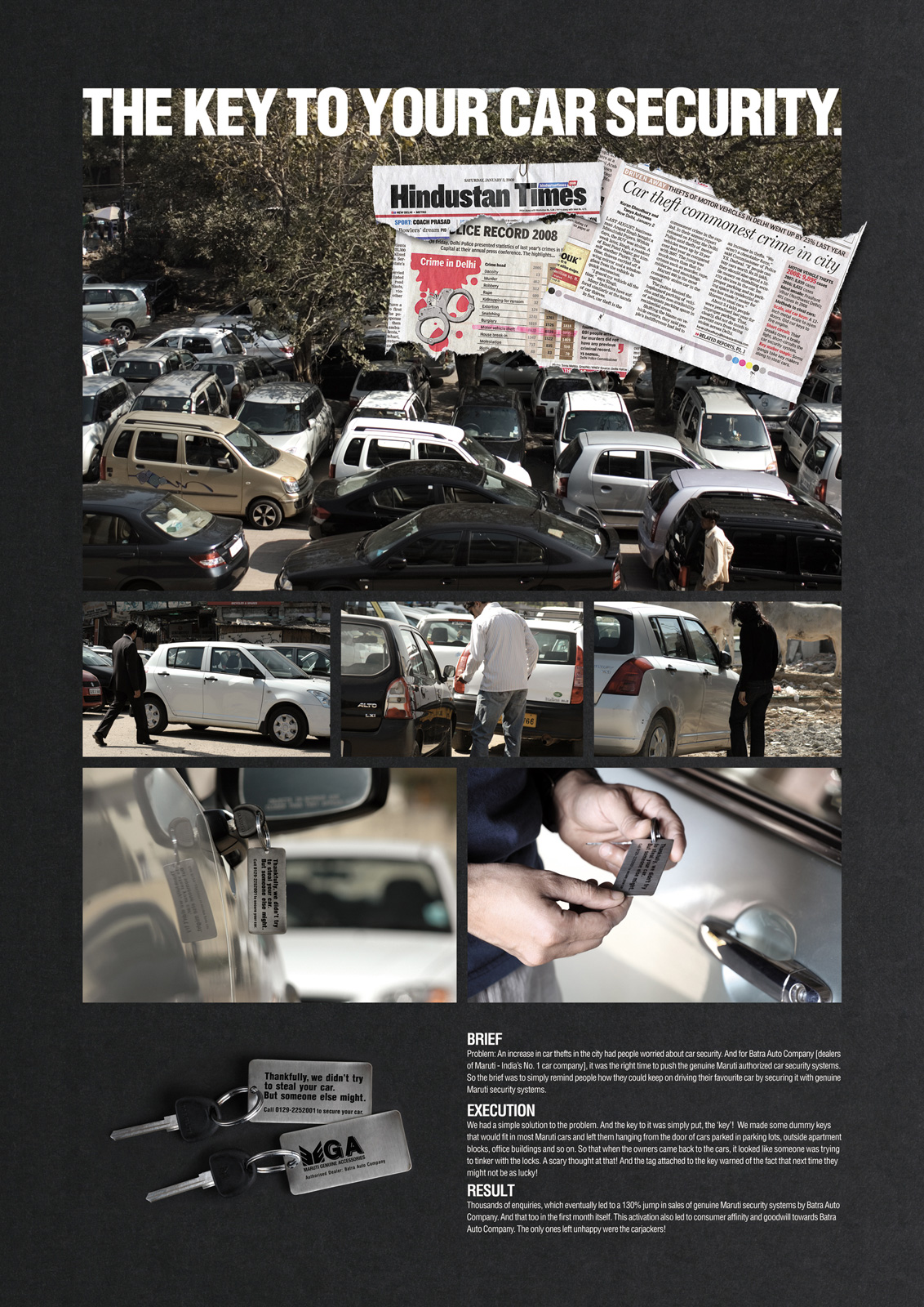 Рекламщики повергают автомобилистов в шокЦелью создания рекламной кампании противоугонных систем Maruti было желание напомнить водителям о необходимости защиты своего транспортного средства от угона. Индийское агентство Ogilvy & Mather нашло элегантное решение данной проблемы. Для кампании были изготовлены ключи, которые подходят к большинству автомобилей Maruti, крупному автопроизводителю на индийском рынке. Ключи были оставлены в дверях автомобилей, припаркованных на обычных стоянках, где и случается львиная доля угонов.Таким образом, когда владелец автомобиля возвращался к своей любимой машине, он видел торчащий в дверях ключ; понятно, какую бурю эмоций и переживаний он испытывал в этот момент. К каждому из ключей прилагался брелок с рекламным текстом. Результаты компании более чем впечатляют - увеличение спроса на Maruti security systems в среднем на 130%. Агентство: Ogilvy & Mather, Gurgaon, India Креативные директора: Ajay Gahlaut, Nitin Srivastava Арт директор: Krishnapriya Dutta Gupta Копирайтер: Kanishka Vashisth |