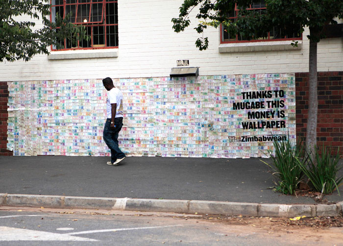 Триллион зимбабвийских долларовЧто бывает, если вовремя не остановитьсяГлавная газета Зимбабве The Zimbabwean вместе с южноафриканским офисом TBWA начала кампанию против режима Роберта Мугабе, который президентствует с 1987 года. Жестокое подавление оппозиции, холера, голод и тотальный коллапс экономики, по мнению местной прессы, это все заслуги Мугабе. Один из тревожных симптомов – банкнота номиналом 100 триллионов долларов – стал главным героем рекламной кампании. На эти деньги зимбабвийские миллиардеры не могут купить даже хлеба. Поэтому TBWA обклеили купюрами стены и заборы Хараре и сопроводили свою акцию слоганом: «Благодаря Мугабе эти деньги годятся только на роль обоев». Art Directors: Shelley Smoler, Nadja Lossgott Copywriters: Raphael Basckin Creative Directors: Nicholas Hulley, Damon Stapleton KAK.RU |