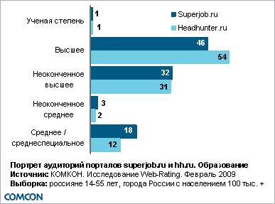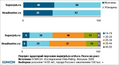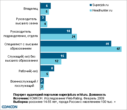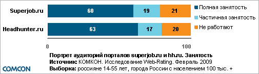КОМКОН переходит на ежемесячное измерение интернет-ресурсов в рамках исследования Web-RatingКомпания КОМКОН переходит на ежемесячное измерение интернет-ресурсов в рамках проекта Web-Rating. Проект Web-Rating был запущен в ноябре «На основании имеющихся данных рекламодатель может запланировать определенное число показов на ресурсе для своей целевой группы. По окончании кампании данные Web-Rating позволяют оценить соответствие запланированных показателей реально достигнутой аудитории.» - поясняет Климент Горчаков, Директор по работе с клиентами компании КОМКОН. Одновременно с увеличением частоты исследования выборка возросла до 10 000 респондентов в возрасте 14-55 лет в месяц (с момента запуска опрашивалось 7 000 респондентов в квартал). Это позволяет анализировать данные не только по федеральным округам, но и по городам-миллионникам. В проекте Web-Rating появилось и еще одно нововведение – стало возможным анализировать аудиторию сайтов по дням. Основное преимущество исследования – возможность анализа профиля аудитории веб-сайтов. Очень удобной является функция сравнения портретов аудиторий различных интернет-ресурсов между собой. Ниже приводится сравнительный портрет аудиторий двух популярных веб-сайтов по поиску работы www.superjob.ru и www.headhunter.ru Сравнение портретов аудиторий Superjob.ru и Headhunter.ru Ежемесячная аудитория портала superjob.ru составляет 3,5 млн. пользователей, портала headhunter.ru – 2,6 млн. пользователей (по данным за февраль Пол и возраст Доли мужчин и женщин, посещающих названные веб-ресурсы, практически идентичны. По этому показателю порталы не имеют принципиальных различий. Подавляющее большинство посетителей обоих порталов составляют люди в возрасте 20-34 лет. Применение методов статистического анализа показывает, что для headhunter.ru более характерной является аудитория в возрасте 25-34 лет. Среди посетителей superjob.ru значимо больше людей 14-19 лет и 35-55 лет. ![]() Образование Большинство пользователей порталов имеют высшее образование, однако доля лиц, закончивших ВУЗ, значимо выше в аудитории Headhunter.ru (54%). Среди посетителей Superjob.ru, напротив, выше доля людей, имеющих среднее или средне специальное образование (18%). ![]() Занятость Большинство посетителей Superjob.ru и Headhunter.ru работают полностью или частично. При этом доля неработающих составляет пятую часть и у одного, и у второго ресурса. Чуть менее половины пользователей Headhunter.ru (47%) являются специалистами с высшим образованием. Доля людей с аналогичной позицией в аудитории Superjob.ru составляет 41%. Среди посетителей Headhunter.ru также выше доля руководителей среднего звена (21% против 18% для Superjob.ru). ![]() ![]() Помимо получения портретов аудиторий веб-ресурсов с возможностью их сравнения исследование Web-Rating также позволяет осуществлять медиапланирование в интернете (в том числе на тематических сайтах), мониторить позиции ресурсов и выполнять тренд-анализ.