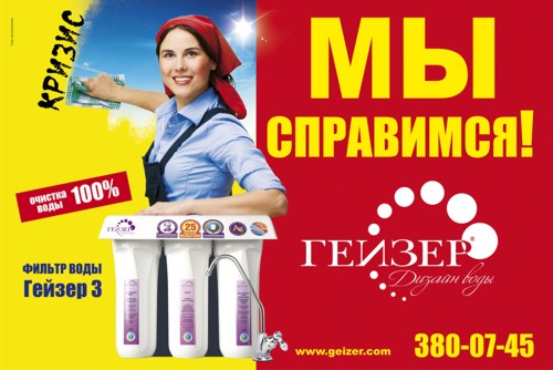 В кризис тоже надо пить вкусноНачалась весенняя рекламная кампания фильтров «Гейзер». Она будет размещаться в метрополитене – московском и питерском. При создании креативной концепции на этот раз обошлись без традиционного семейства. Теперь на мекетах борется с кризисом румяная тётя. Напомним, предыдущая кампания «Гейзера» проходила в новогодние праздники. В октябре 2008 в региональном эфире появился видеоролик. А в мае прошлого года в городах-миллионниках прошла рекламная кампания из трех этапов. Она носила название «Можно пить вкусно». |