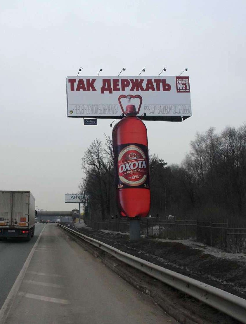 В результате совместной работы агентств Publicis United (идея и творческое исполнение), Vizeum (медиапланирование), Magic Touch (воплощение нестандартной идеи), Master Ad (баинг медианосителей) и outdoor-оператора Gallery (предоставление и монтаж конструкций) появилась нестандартная наружная реклама в виде огромной бутылки пива с держателем, которая иллюстрирует преимущества новинки от пива "Охота" - удобство транспортировки продукта и простоту использования.