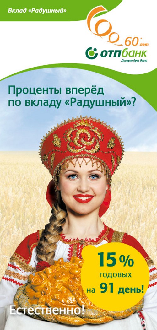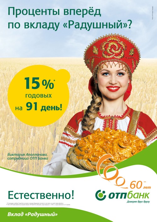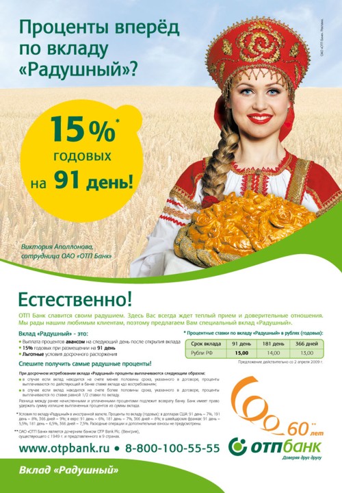 Венгерский ОТП Банк показывает русский колоритНа смену салями пришел каравайОТП Банк запустил второго апреля весеннюю рекламную кампанию, посвященную депозиту "Радушный". Она была разработана in house сотрудниками Управления маркетинга и рекламы. В качестве визуального решения был использован яркий образ русской красавицы с караваем. В качестве модели выступила сотрудница банка Виктория Аполлонова. "Каравай в русской культуре традиционно считается символом радушного отношения к гостям", - поясняет Александр Рукавишников, начальник Управления маркетинга и рекламы, заместитель директора Дирекции маркетинга и стратегических коммуникаций ОТП Банка, - Используя этот образ в рекламе, мы хотели подчеркнуть наше внимательное и доверительное отношение к клиенту". Создатели этой рекламной кампании пророчат своему радио-ролику судьбу народного хита этой весны. В нем удалой хор распевает "Проценты, проценты, проценты вперед!" на мотив "Калинки-малинки". Рекламная кампания проходит в Москве, Санкт - Петербурге, Самаре, Нижнем Новгороде, Новосибирске, Иркутске и Омске стартовала со 2 апреля. Задействованы такие каналы коммуникации, как наружная реклама, пресса, радио, метро, Интернет и региональное телевидение. Как ранее сообщал Sostav.ru, в феврале банк запустил рекламную кампанию "Венгрия ближе". Состав творческой группы: Управление маркетинга и рекламы: Александр Рукавишников - начальник Управления маркетинга и рекламы - заместитель директора Дирекции маркетинга и стратегических коммуникаций Илья Назаров - начальник Отдела продвижения банковских продуктов Камила Такташева - копирайтер Игорь Плискунов - дизайнер
