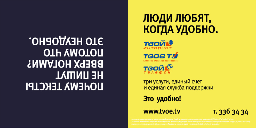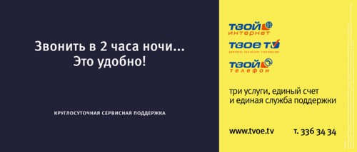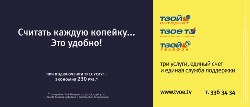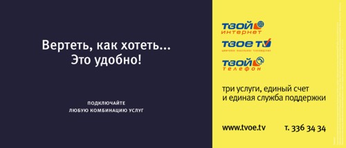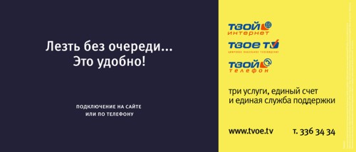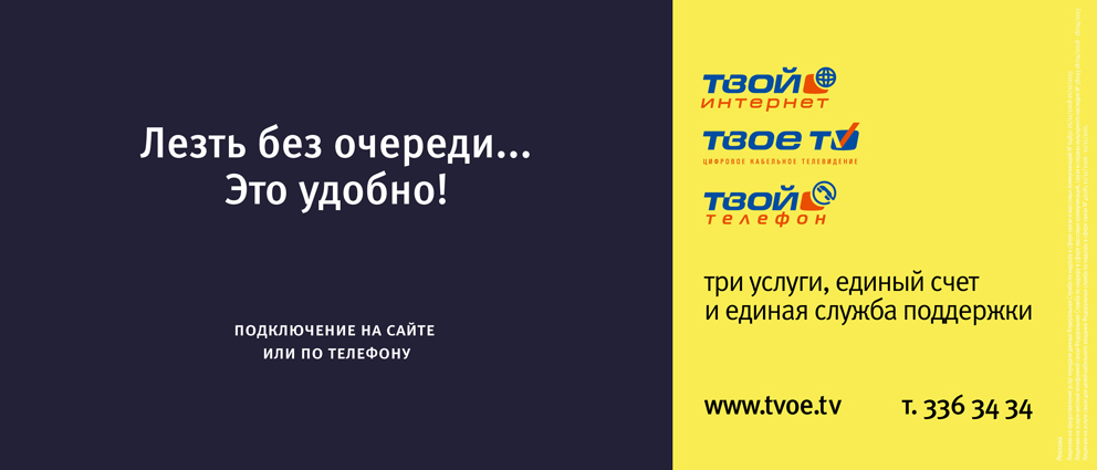 Странные люди от РА "Небо"Рекламная кампания для ТКТВ марте "Телекомпания Санкт-Петербургское кабельное телевидение" (ТКТ) запустила в Санкт-Петербурге широкомасштабную рекламную кампанию, поддерживающую запуск услуги Triple Play. Креатив новой рекламной кампании был разработан агентством "Небо". Triple Play - это единая услуга по предоставлению телевидения, интернета и телефонии по одному каналу. Запуск Тriple Play сопровождается специальной рекламной акцией "Твой телефон - подарок" для существующих и потенциальных абонентов, которая проходит с 16 марта по 30 апреля 2009 г. Для привлечения внимания потенциальных пользователей были задействованы различные средства коммуникации. Indoor-реклама включает в себя инфодоски в домах с сетью ТКТ и адресную рассылку в виде буклета-газеты, информирующего потенциальных клиентов об услугах и сервисах компании. В интернете о новой акции можно будет узнать через баннерную и контекстную рекламу. В метро информация будет представлена на путевых щитах на станциях и на стикерах на дверях вагонов. В рамках рекламной кампании был создан телевизионный ролик, который рассказывает о странных людях. "Они живут по своим правилам: звонят среди ночи, "лезут" без очереди, считают каждую копейку, привыкли получать всё и сразу, и при этом не испытывают ни малейшего неудобства. Ведь с тремя услугами от ТКТ они обладают иными возможностями!", - рассказывают в ТКТ. Хронометраж ролика - 30 секунд, короткие версии - 15 и 5 секунд. Ролик будет транслироваться с 27 марта по 9 апреля на каналах "Первый", СТС, ТНТ, "Домашний". Состав творческой группы: Компания ТКТ: Директор по маркетингу - Елена Паснюк Руководитель департамента брэнд-направления - Елена Филимонова Агентство "Небо": Креативный директор - Владислав Макаров, Наталья Смелова Старший копирайтер - Татьяна Виноградова Старший арт-директор - Сергей Кожара Аккаунт-менеджер - Анна Полуектова Продакшен - Belka&Strelka: продюсер - Елена Белкова режиссер Сираж Джавери оператор - Андрей Вакорин пост-продакшен - Postproduction.ru композитор - Виктор Сологуб |