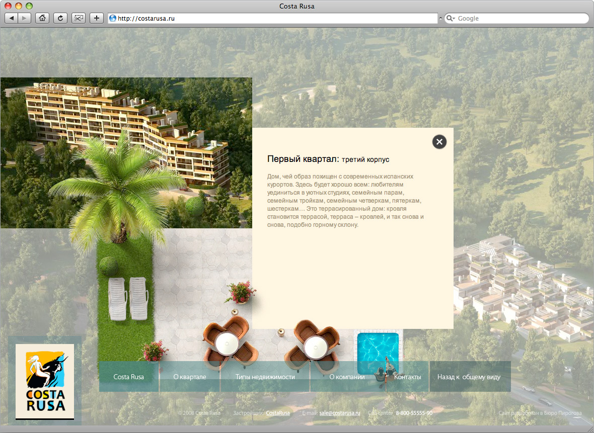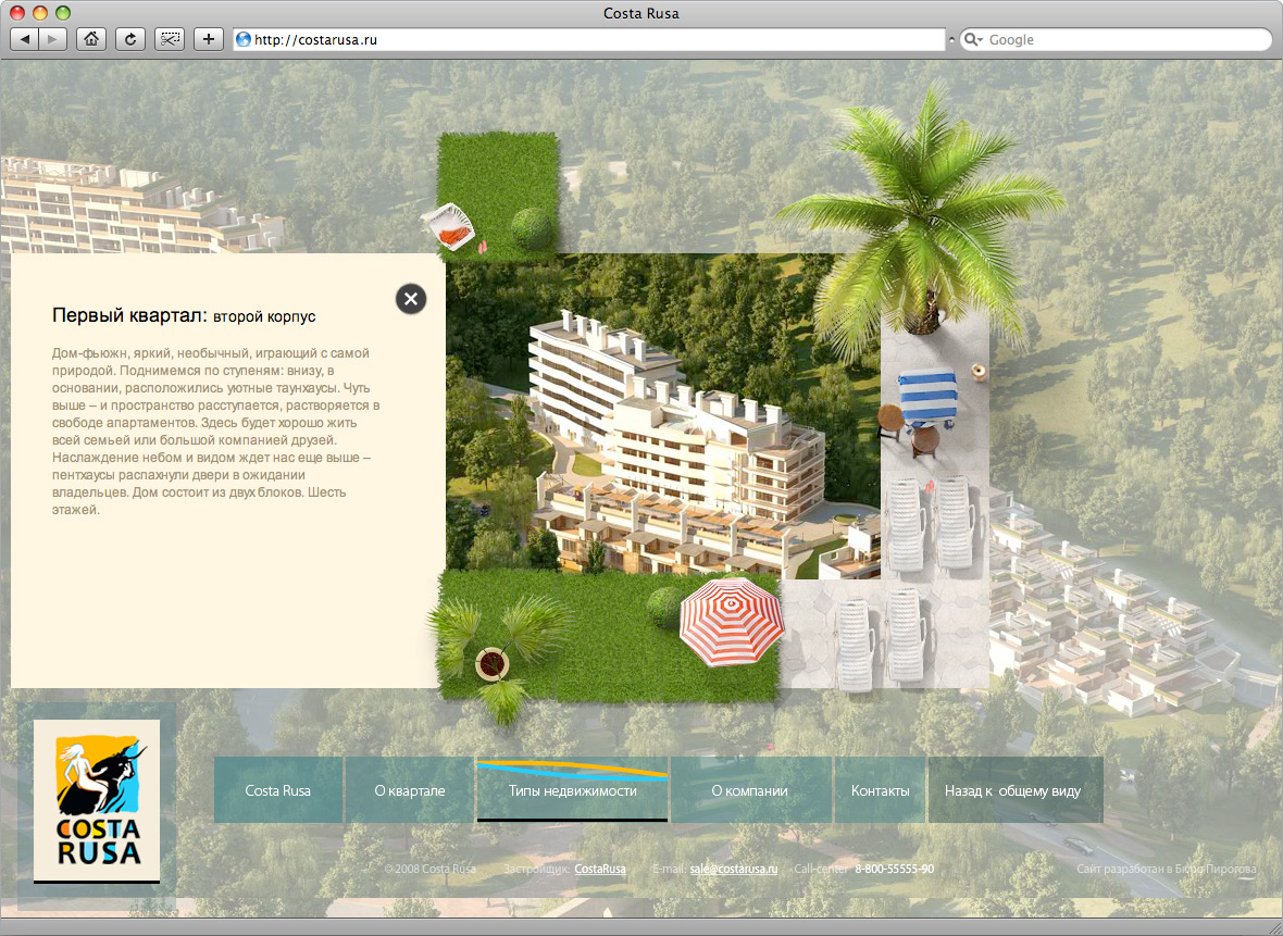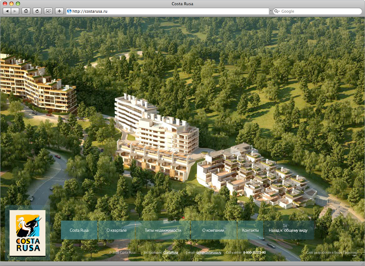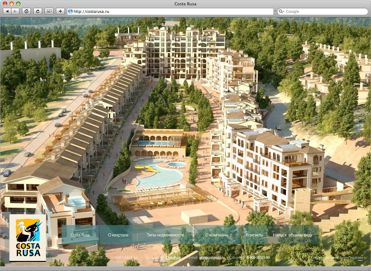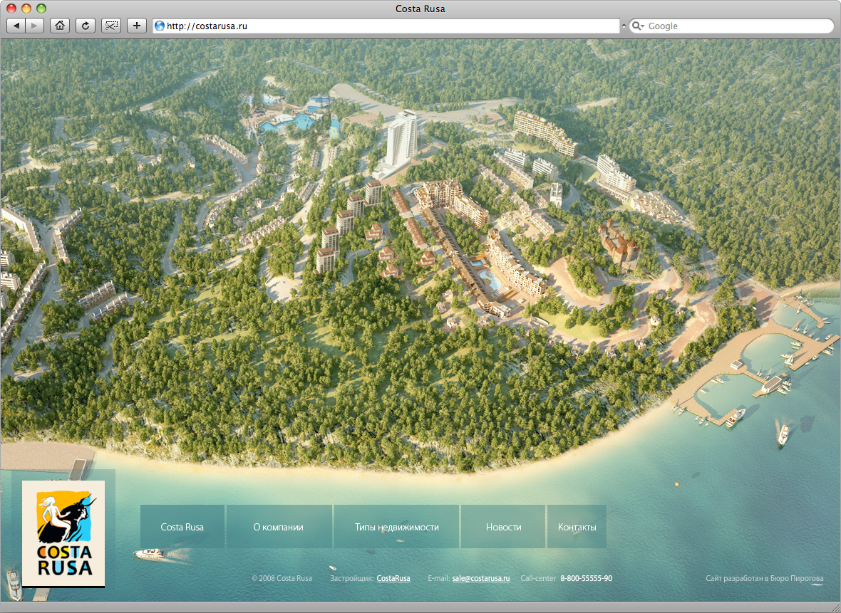 Бюро Пирогова анонсирует первый этап проекта – сайта города-курорта Costa RusaCosta Rusa – новый курортный комплекс в Туапсинском районе Краснодарского края. Это город, спроектированный по европейским стандартам: 14 кварталов, выполненных в оригинальной архитектурной концепции, тщательно спланированная инфраструктура в сочетании с целебным приморским климатом. Комплекс находится в стадии строительства. Сайт курортного города – это масштабный проект, который предполагает поэтапную презентацию. Визуализация кварталов в онлайне происходит по мере строительства комплекса. В настоящий момент 3D-отделом Бюро Пирогова детально визуализировано 2 квартала – первый и четвертый. В полноценной версии сайта их будет 14. Основная задача сайта – продажа недвижимости, поэтому визуализации архитектурных сооружений было уделено особое внимание. На основании генплана застройки и чертежей были созданы высокополигональные рендеры, реалистично повторяющие будущий облик курортного города. Возможности флеша позволяют приближать объекты недвижимости для детального ознакомления. Кроме того, для каждого здания предусмотрена отдельная внутренняя страница, содержащая всю необходимую для покупателя информацию и планировки. Интересной особенностью проекта стал уникальный флеш-редактор, разработанный программным отделом Бюро Пирогова. С его помощью можно свободно моделировать внешний вид локаций комплекса по собственному вкусу. В рамках блока с описанием корпуса, редактор позволяет менять местами слои, расставлять заранее разработанные ландшафтные объекты. Эта технология дает возможность клиенту как самостоятельно так и под чутким руководством специалистов Бюро Пирогова принимать непосредственное участие в создании проекта. |
