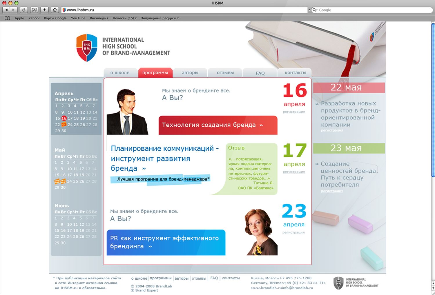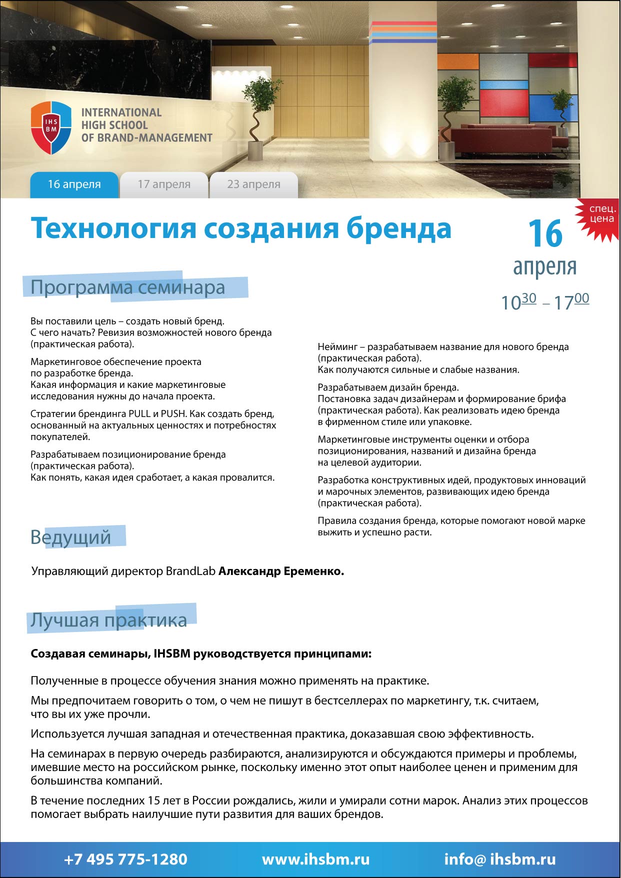 Бренд-Менеджмент в брендинге BrandLabBrandLab завершила проект по разработке визуальной идентичности бренда для Международной Высшей Школы Бренд-Менеджмента (IHSBM)В ходе проекта BrandLab разработаны фирменный знак и корпоративный стиль школы, дизайн деловой и учебной документации, оформление методических материалов, BrandBook, а также вебсайт www.ihsbm.ru. IHSBM - бизнес-школа, специализирующаяся на проведении краткосрочных образовательных программ, семинаров и мастер-классов по брендингу. Авторами и преподавателями выступают лучшие эксперты по управлению и развитию брендов - практики, которые достигли успехов и вывели компании в лидеры в России и зарубежом. В апреле-мае пройдут первые мастер-классы IHSBM, авторами которых стали представители Beeline, Samsung, L'Oreal, Mediacom. ![]() ![]() ![]() |