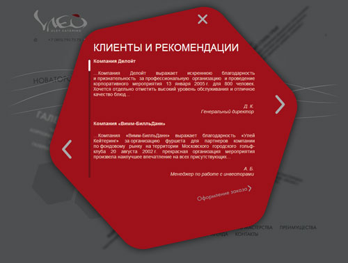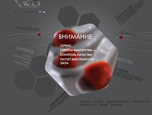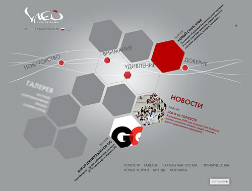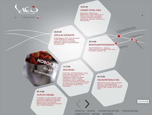 Сладкий сайт "Улей Кейтеринг" от агентства "Астроним*"Уникальная и стильная Flash и AJAX-скриптовая анимация в новой технологической концепции web сайта от Астроним*, соответствует позиционированию самой компании "Улей Кейтеринг" - "Новаторство, Внимание, Удивление и Доверие", практикующей только индивидуальный подход к решению задач клиента и имеющей свой собственный, легко узнаваемый стиль."Нам важно было полностью воплотить новую концепцию айдентики Улья. Новые цвета, элементы и принципы их подачи. Мы хотели символически отобразить не только важные основополагающие традиции, которые используем в работе, но и динамичность, современность нашей компании, стремление вперёд. Наполнив сайт яркими фотоматериалами и сохранив при этом общий лаконичный стиль, в основу сайта мы положили новые атрибуты брэнда - в фирменных сотах www.uley.ru теперь подается только самая интересная, привлекательная и свежая информация. Совместно с Астроним*ами мы решили сделать сайт с одной стороны информативным и интересным, с другой стороны ничуть не перегруженным информацией. К тому же особое внимание мы обращали на использование различных принципов навигации, например, сквозной навигации по сайту" - рассказывает Ирина Авруцкая, директор по маркетингу "Улей Кейтеринг". Технологически на "вкусном" сайте Улья присутствует полезный и уникальный для российского рынка банкетного обслуживания программный модуль "Расчет вместимости зала", который состоит из калькулятора двух направлений: "Расчёт количеcтва человек" и "Расчёт площади".