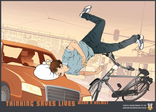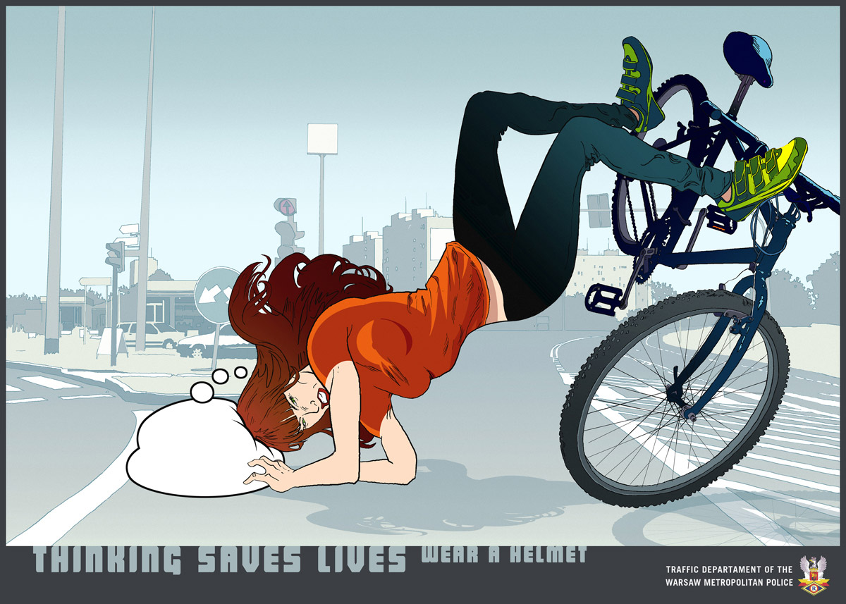Варшавская полиция советует больше думать головойВ современном мире толчеи и пробок все больше людей предпочитает передвигаться на мотоциклах, скутерах и велосипедах. Такие виды транспорта достаточно травмоопасны, поэтому совершенно логичным является использование шлема, но многие люди не знают или не понимают этого. Чтобы повысить информированность поляков об этой серьезной проблеме? рекламное агентство McCann Erickson Polska по заказу Управления Дорожного Движения Городской Полиции Варшавы (Traffic Department of the Warsaw Metropolitan Police) разработало социальную кампанию в стиле комиксов. С помощь этих принтов креаторы призывают больше думать своей головой, чтобы в конечном итоге сберечь ее. Вообще, проблема использования шлемов стоит во многих странах достаточно остро, так, например, датский Совет по безопасности дорожного движения спрашивает у молодежи, что круче: шлем или разрушение мозга, австралийские креаторы советуют не быть овощем, а канадцы сравнивают разбитую голову с пазлом. Слоган: «Размышления спасает жизнь. Носи шлем.» Агентство: McCann Erickson Polska, Варшава, Польша |