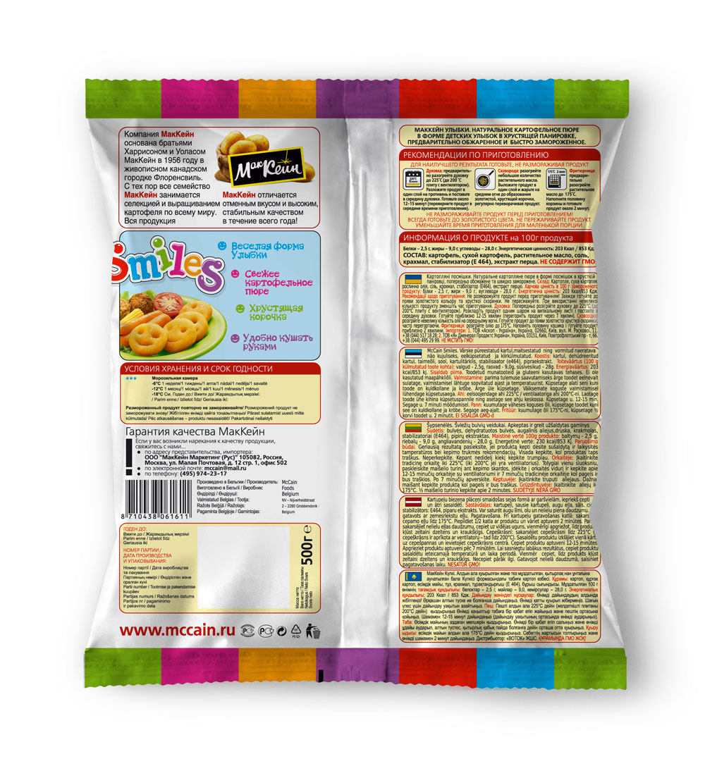 Улыбчивая картошкаДизайн "Внешнего вида"Брендинговое агентство "Внешний Вид" произвело ребрендинг "детской" позиции Smiles фигурного картофеля фри канадской компании McCain. Впервые, как утверждает "Внешний вид", на рынке плодо-овощной заморозки в качестве key-visual на упаковке создан реалистичный рисованный образ людей, выполненный в западно-европейском стиле и гармонично сочетающийся с англоязычным название продукта и лейблом производителя. Позиция с новым дизайном уже 5-й месяц подряд демонстрирует стабильный рост продаж на фоне общего спада потребления. Состав творческой группы Арт-директор: Николай Шумков Иллюстратор: Татьяна Доронина Дизайнер: Роман Карочкин Фото и фудстайлинг: Антон Горбачев |