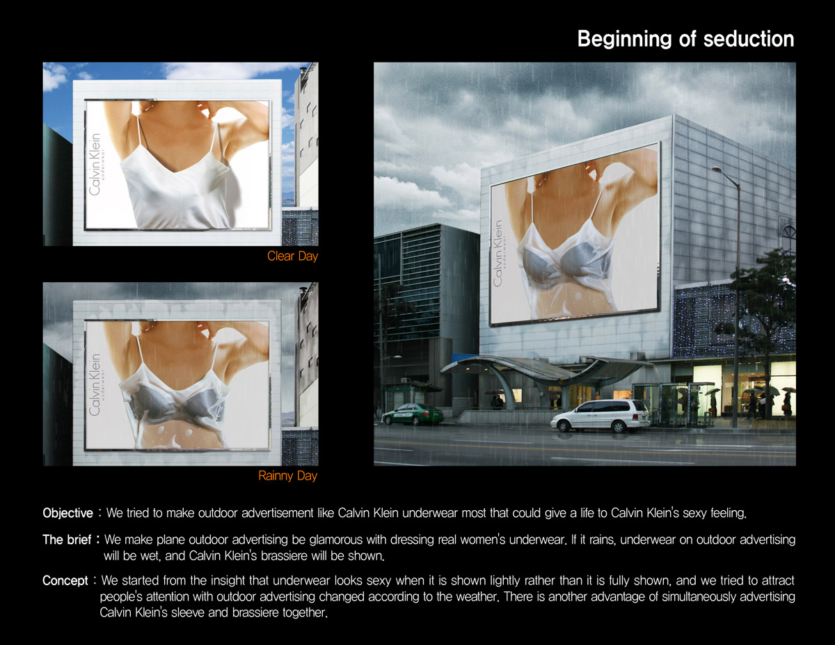 Билборд Calvin Klein меняется в зависимости от погодыВ Южной Корее тоже попадаются талантливые креаторы. Это доказывает еще одна работа от молодой творческой группы из корейского университета Chosun University, которая не далее, как вчера, уже демонстрировала свое творение для игровой приставки Sony Playstation 3. Сегодня эти же креаторы решили показать свое умение и смекалку в создании outdoor-кампаний, разработав оригинальный билборд для рекламы нижнего белья Calvin Klein. Логично предположив, что нижнее белье выглядит сексуальнее, когда предстает зрителю как бы случайно, корейцы создали щит, который меняется в зависимости от погоды.