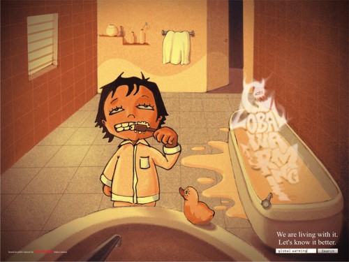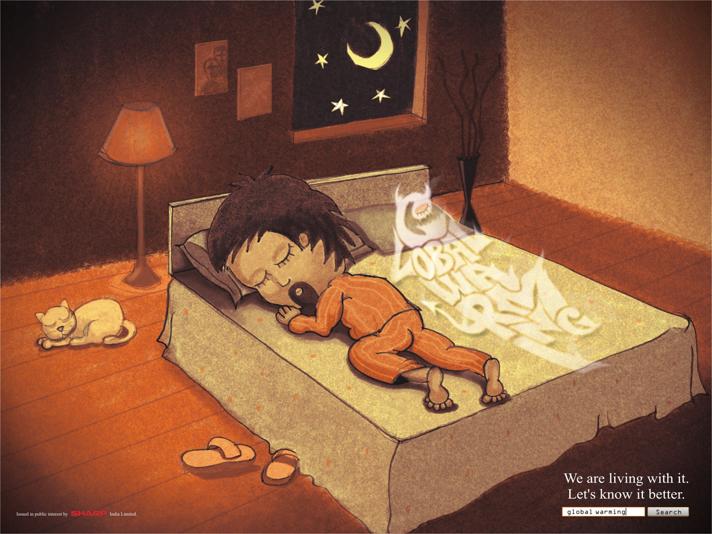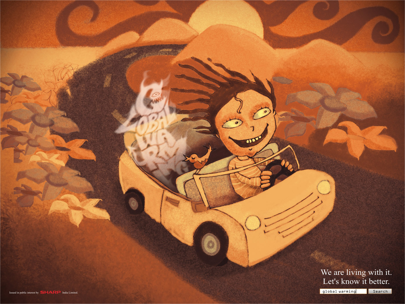 Sharp предлагает поближе познакомиться с глобальным потеплениеО глобальном потеплении сегодня "знает" каждый, но мало кто действительно изучал этот серьезный вопрос, весящий над человечеством дамокловым мечом. Кто-то уверен, что такой проблемы не существует вовсе, кто-то считает, что его это не касается, а кто- то, как всегда, надеется на "авось".Индийское представительство японской корпорации Sharp - Sharp India Limited, демонстрируя свою социальную ответственность, поручило рекламному агентству Percept/H разработать кампанию, цель которой - повышение уровня информированности населения Индии о проблеме глобального потепления. Слоган: "Мы живем с этим. Давай узнаем его получше. Агентство: Percept/H, Пун, Индия Арт-директор / Иллюстратор: Ojas Parkhi Копирайтер: Priyanka Raj |