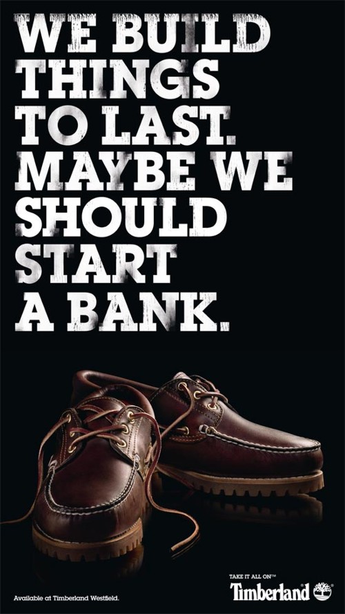 Timberland наступают на банкиАмериканский обувной бренд Timberland не удержался от того, чтобы пройтись по мировым финансовым проблемам, сообщает Guardian.Timberland запустили новую рекламную кампанию, в которой противопоставляется прочность и долговечность обуви этой марки и несостоятельность банковских и иных финансовых структур. Агентство Leagas Delaney разработало рекламные плакаты, которые должны показать, что обувь Timberland остается надежной в самых сложных обстоятельствах. "We build things to last. May be we should start a bank", - гласит рекламный слоган на одном из плакатов, который появился сегодня в районе площади Оксфорд-Серкус и торогового центра Westfield. Надпись означает "Мы создаем долгосрочные вещи. Возможно, нам стоит открыть банк". На другом объявлении красуется надпись "One American institution that won't fall apart" - "Единственная американская вещь, которая не развалится". Глеб Кузнецов, Sostav.ru