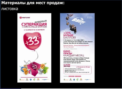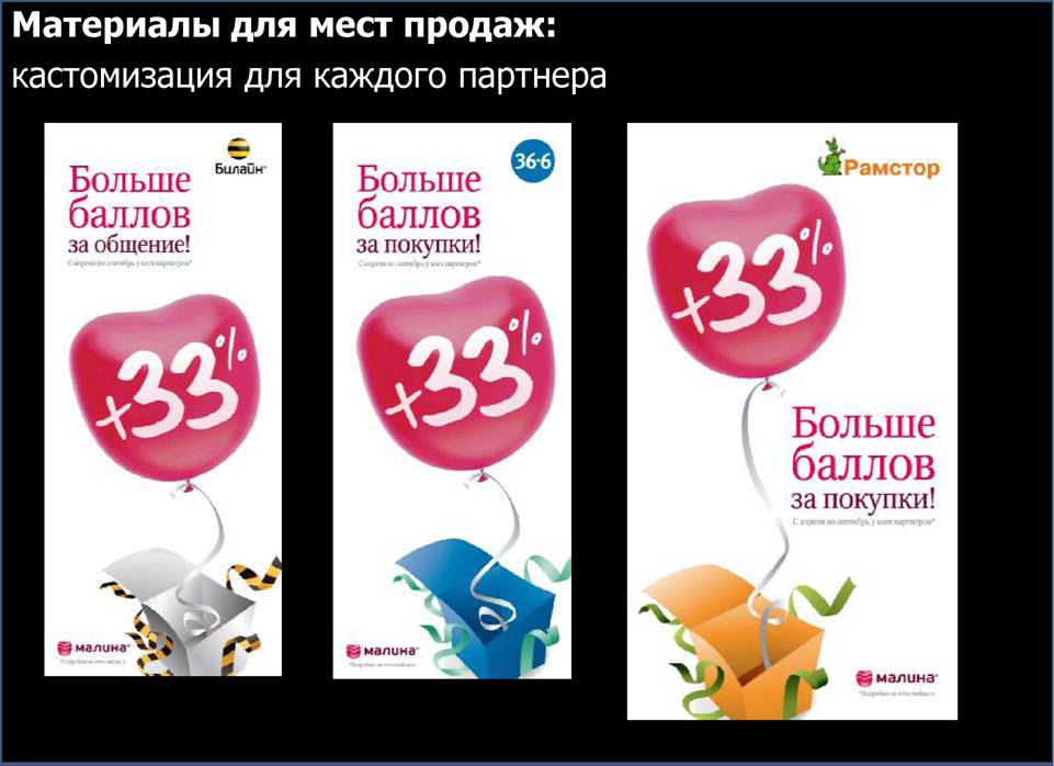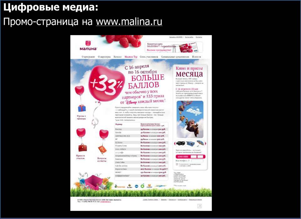 Программа "Малина" ускоряется в кризисБаллы будут накапливаться на треть быстрееВ условиях экономического кризиса компании "Рамстор", "Билайн", "Аптечная сеть 36,6", ВР, "Росинтер Ресторантс" и "Формула Кино" объединили усилия, чтобы запустить совместную акцию в рамках программы "Малина". В течение 6 месяцев, начиная с 16 апреля, участники программы будут получать на 33 % больше баллов на карту МАЛИНА, чем обычно. В рамках акции, совместно с компанией Disney, программа "Малина" будет разыгрывать билеты на предпремьерные показы фильмов и другие ценные призы от Disney. Каждый месяц будет определяться 333 участника, собравших больше всего баллов за этот период. Акция продлится до 16 октября. |