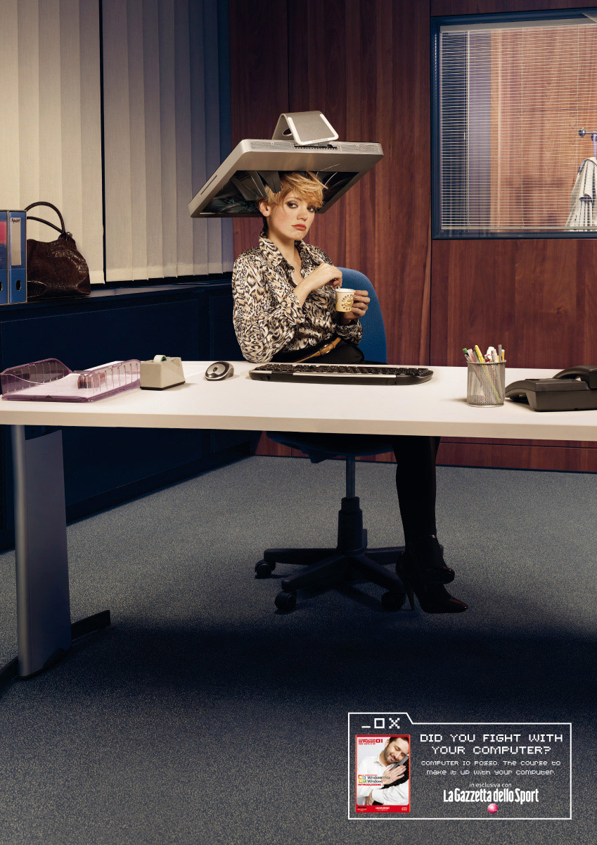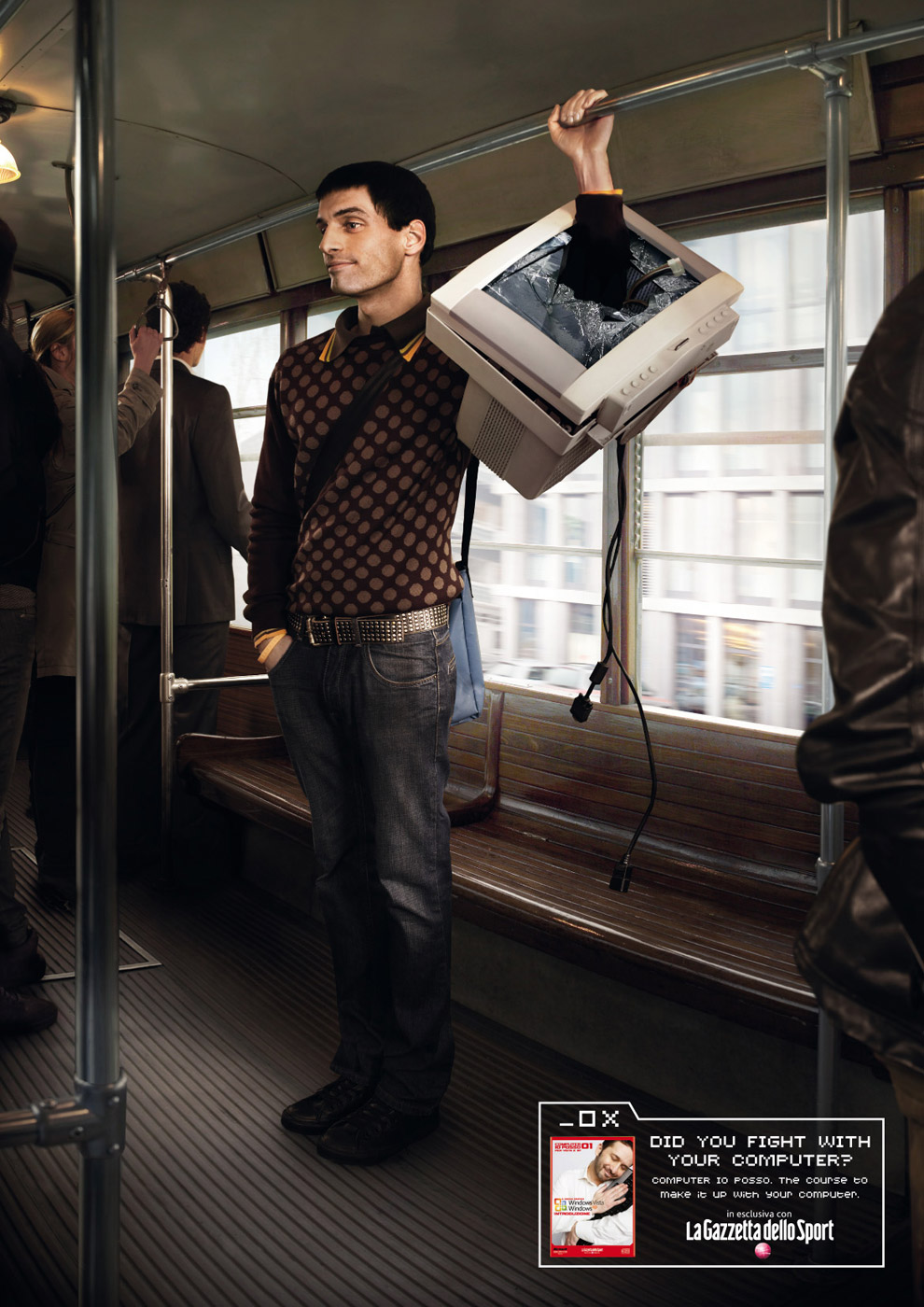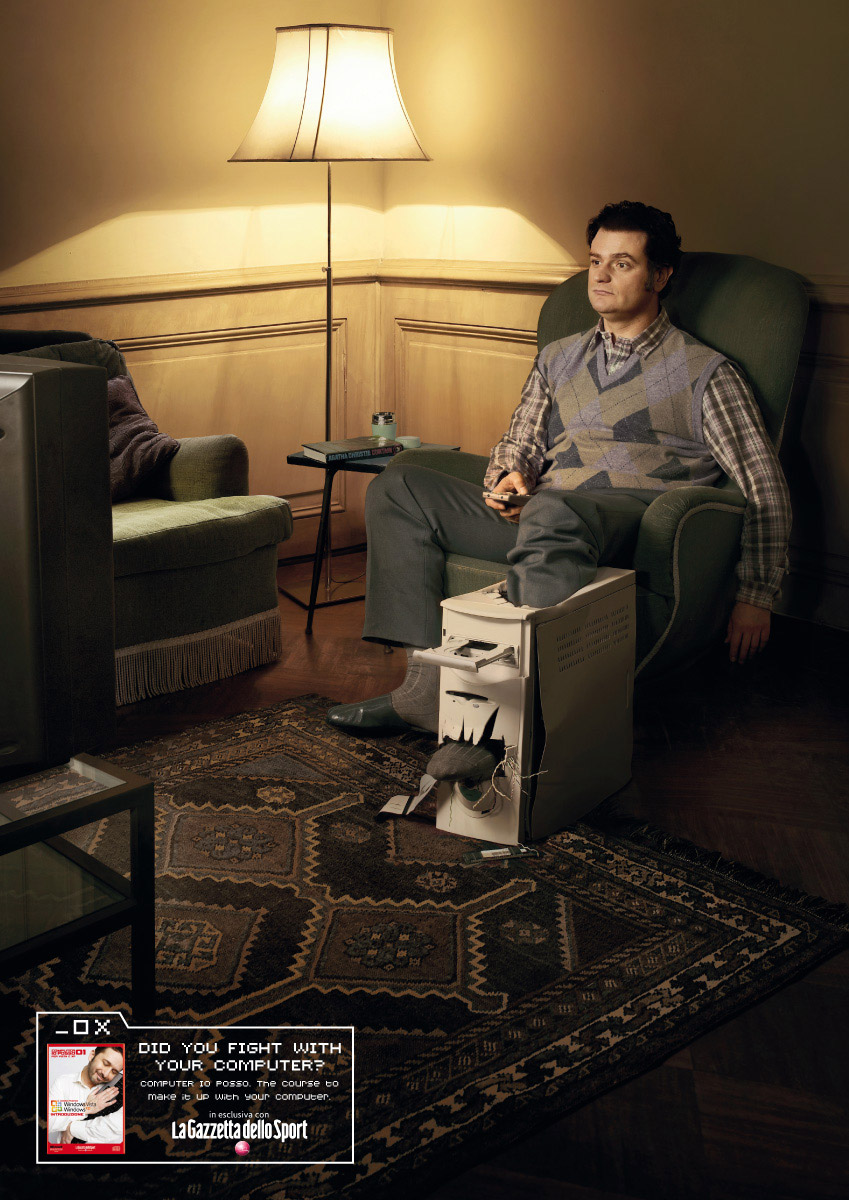 Следы побоев на этих принтах являются отнюдь не результатом семейной драмы или уличных разборок… Таким «жестоким» способом креаторы из итальянского РА Mccann Erickson Milan решили показать мучения некоторых людей, у которых никак не получается совладать со своим компьютером. Поможет этим «чайникам» компьютерный журнал Computer Io Posso, который выпускается главная итальянская ежедневная спортивная газета La Gazzetta dello Sport, чья история началась еще в конце XIX века.
