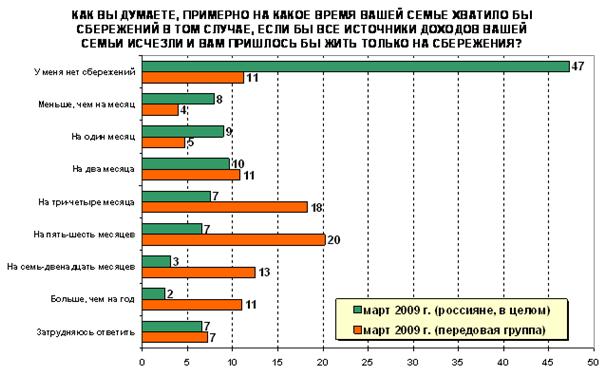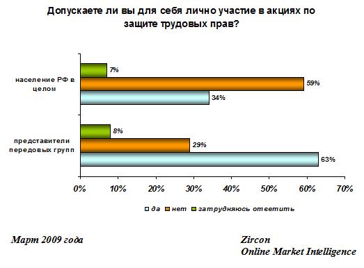 Восстания уволенных менеджеров не будет?Проведенное исследовательской группой ЦИРКОН при поддержке Московского центра Карнеги и при участии компании Online Market Intelligence исследование не подтвердило широко представленные в СМИ утверждения, что больше всего от кризиса пострадал «средний класс». По меньшей мере, на уровне ожиданий в отношении ближайшего будущего представители т.н. «передовых групп» выглядят гораздо более оптимистичными, чем россияне в целом: две трети участников онлайн панели (65%) ожидают улучшения ситуации в ближайший год (против 23% среди населения в целом). В то же время с пессимизмом смотрят в будущее более четверти российских граждан (28%) и лишь 5% «панелистов».Опрос общественного мнения по теме «Защита трудовых прав граждан» проводился в период с 19 по 27 марта 2009 года. Объем выборочной совокупности всероссийского омнибуса составил 1603 респондента. Метод опроса – личное формализованное интервью по месту жительства. Впервые одновременно с общенациональным опросом населения по аналогичной анкете был реализован онлайн-опрос участников Интернет панели компании OMI (Online Market Intelligence), в котором из панели были отобраны так называемые «передовые группы населения» или «средний класс» (люди с высоким доходом, высокой самооценкой социального статуса и материального положения и высоким уровнем Интернет-активности). Объем выборочной совокупности онлайн панели составил 548 респондентов. Очевидно, что оптимизм опрошенных представителей «передовых групп» в значительной степени связан с их нынешними сравнительно позитивными оценками собственно материального положения, в том числе, выраженного в наличии у них сбережений. Согласно данным опроса населения, только у пяти процентов россиян имеющихся сбережений хватит больше чем на полгода. Почти половина опрошенных (47%) не имеют никаких сбережений. Совсем иная ситуация – среди представителей «передовых групп». Об отсутствии сбережений заявил лишь примерно каждый десятый участник онлайн панели; почти четверть из них смоги бы прожить за имеющиеся сбережения более чем полгода. ![]() Несмотря на то, что некоторые показатели социального самочувствия россиян имеют тенденцию к снижению, большинство граждан (59%) не допускают для себя лично участия в акциях в защиту трудовых прав. Вместе с тем, около трети опрошенных выразили готовность к участию в организованных выступлениях в защиту трудовых прав в будущем. Представители «передовых групп» не в пример активнее: уровень декларируемой готовности к участию в акциях протеста вдвое выше, чем среди россиян в целом (63%), притом, что значения показателей социального самочувствия опрошенных участников онлайн панели заметно более высоки. ![]() Как показал анализ результатов опроса, на декларируемую протестную активность в большей степени влияет не социальное самочувствие, а включенность в социальные коммуникации. Как выяснилось, сегодня граждане активно обсуждают проблемы соблюдения трудовых прав: 70% представителей «передовых групп» и 40% населения в целом принимали участие в таких обсуждениях в кругу семьи; 49% представителей «передовых групп» и 36% населения в целом обсуждали эти вопросы с коллективом (в % от работающих по найму), 25% и 5%, соответственно, – участвовали в Интернет-дискуссиях. При этом граждане, допускающие для себя возможнос