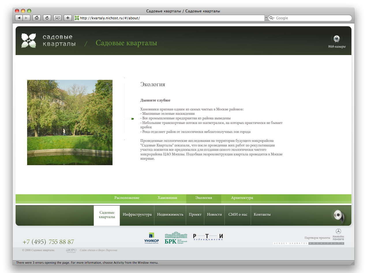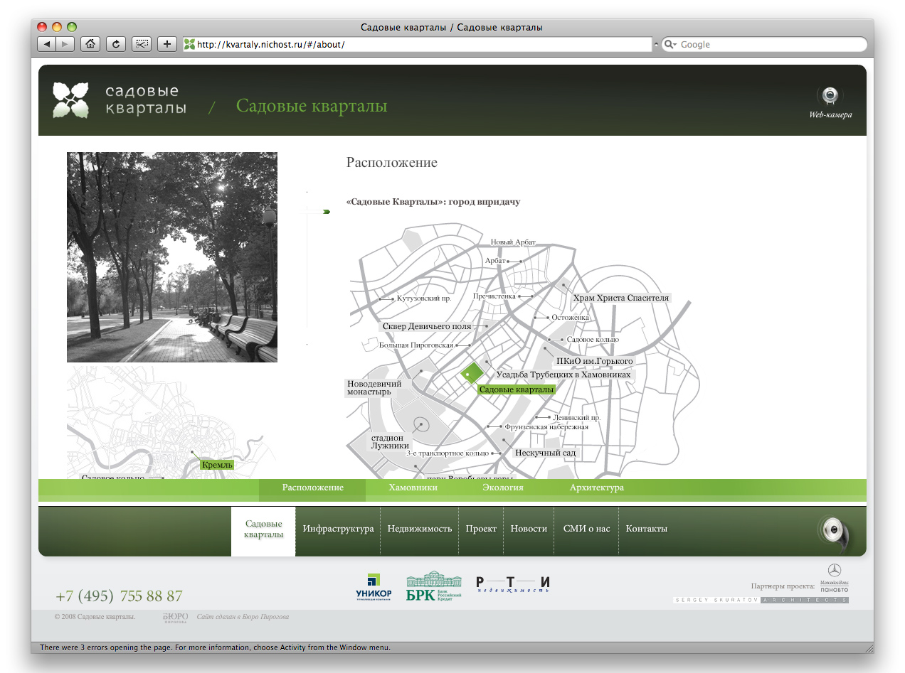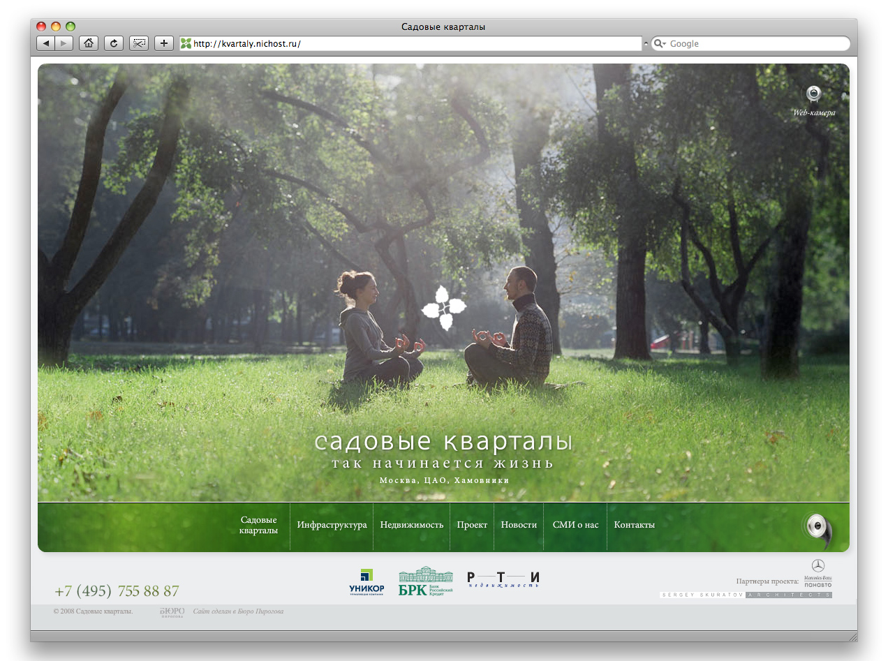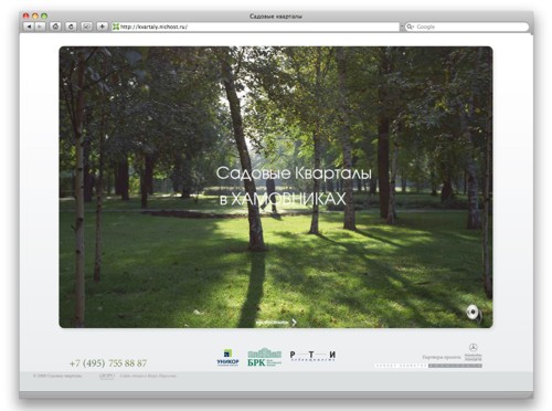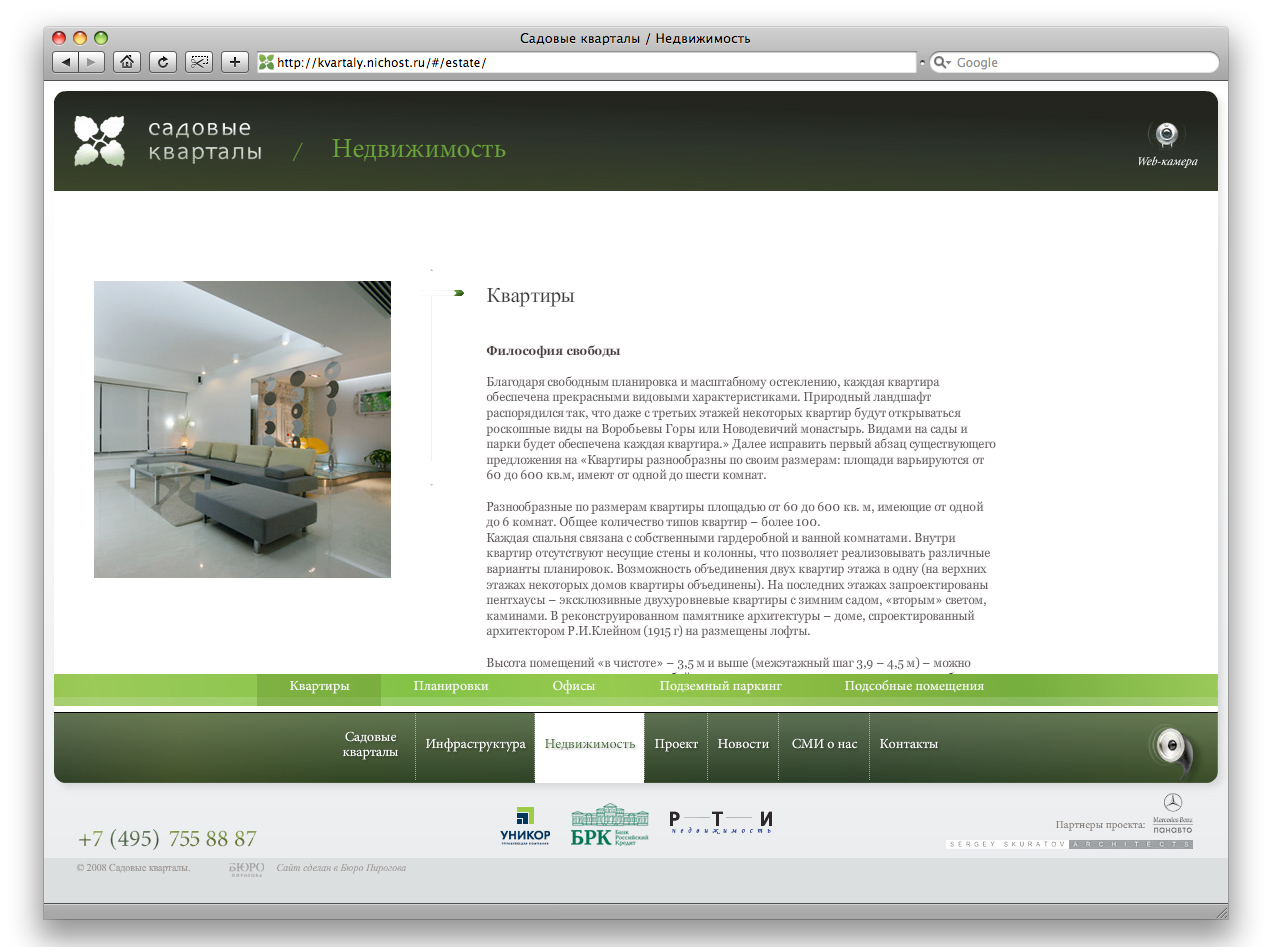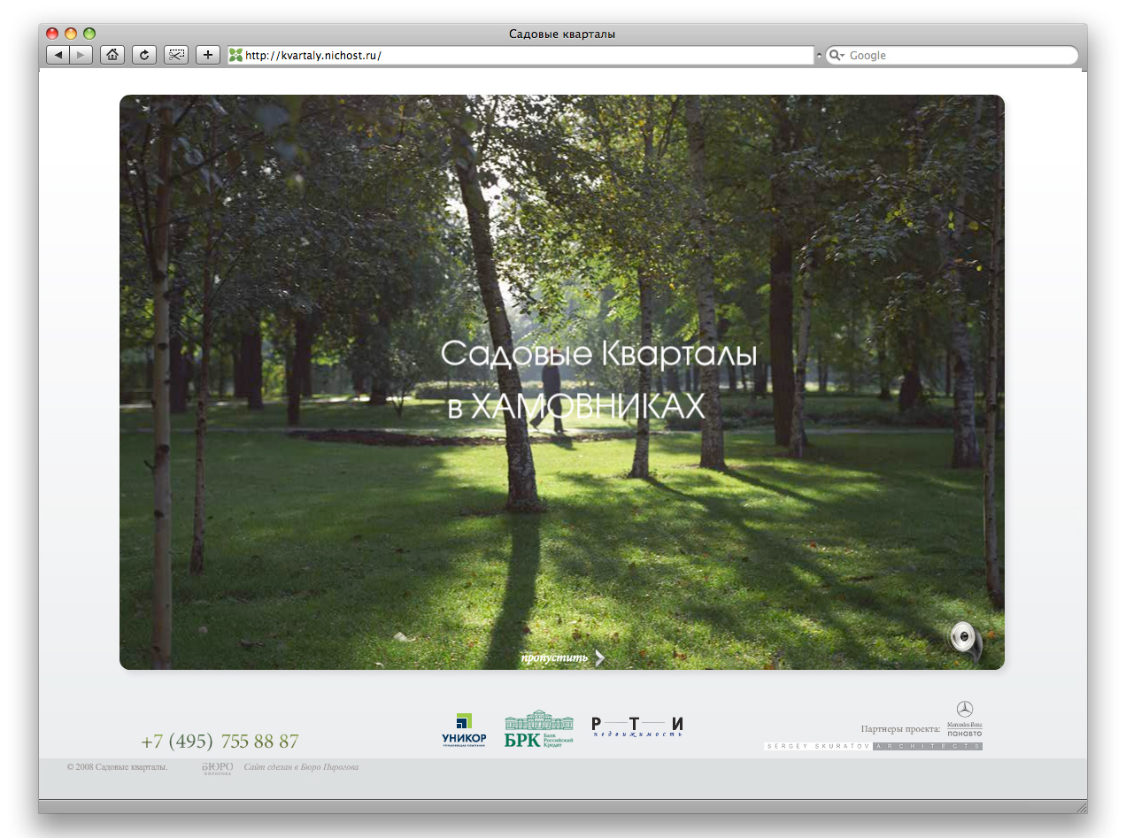 Компания Бюро Пирогова построила в интернете Садовые кварталы«Садовые кварталы» – строящийся в центре Москвы уникальный микрорайон с элитным жильем, современным ландшафтным дизайном и развитой инфраструктурой. В компании Бюро Пирогова разработан сайт, объединяющий визуальную и текстовую информацию, оригинальные технологические решения, эмоциональную подачу строительных объектов. Прелоадером выступает промо-ролик, финальный кадр которого переходит в главную страницу. Каждый раздел этого флеш-сайта имеет собственный url. Главным отличием проекта является горизонтальная прокрутка, интуитивно понятная пользователю благодаря привычному обращению с книгами. А для тех, кто привык к традиционному способу просмотра сайтов, оставлена возможность вертикального скроллинга. Интерактивный генеральный план территории позволяет видеть, как будут выглядеть готовые жилые здания, объекты инфраструктуры, прогулочные зоны. Кроме этого, на сайте представлены типовые планировки квартир, сгруппированные по метражу. Проект находится в стадии бета-тестинга. |