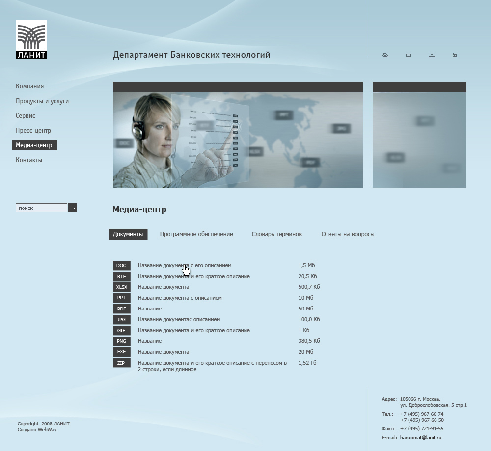 Еще в 2006 году "ЛАНИТ" обратился в РА Webway с просьбой провести анализ общего присутствия Группы компаний и ее составляющих в Интернет и разработать рекомендации по их модернизации. Результатом исследований стал масштабный аналитический отчет и концепция разработки сайта "ЛАНИТ", сайтов и подсайтов входящих в Группу департаментов и компаний, которая с 2007-го года планомерно внедряется в жизнь. Параллельно РА Webway велись работы по созданию фирменных полиграфических материалов и презентаций для отдельных проектов, таких как, например, Дмитровский технопарк. В ушедшем 2008 году было реализовано максимальное за всю историю сотрудничества количество веб-проектов, в число которых вошли титульная страница Группы компаний "ЛАНИТ", сайт Генеральной Ассамблеи Международной организации уголовной полиции (ИНТЕРПОЛА), а в январе 2009-го увидел свет новый сайт "Департамента банковских технологий "ЛАНИТ". При создании сайта удалось решить сразу две задачи: сделать его оригинальным и самобытным, но при этом полностью соблюсти все правила использования корпоративного стиля "ЛАНИТ". |