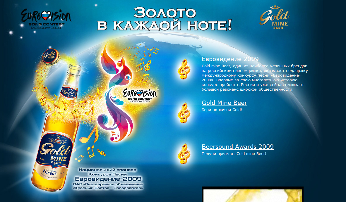 Gold mine Beer сделал сайт в поддержку "Евровидения"Gold mine Beer, запускает сайт в поддержку проекта спонсорства конкурса песни Евровидение 2009. Посетители ресурса смогут узнать больше о Gold mine Beer и связи бренда с международным фестивалем песни "Евровидение", который пройдет в Москве в мае 2009 года. На сайте размещены свежие новости о бренде, а также подарок от Gold mine Beer для всех меломанов - конкурс Beersound Awards 2009.Запуск сайта Gold mine Beer приурочен к началу конкурса "Евровидение-2009". Пивоварня "Красный Восток-Солодовпиво", входящая в состав Группы компаний EFES в России, является Национальным спонсором этого мероприятия. Дизайн сайта Gold mine Beer выполнен в узнаваемой стилистике бренда и прост для пользовательской навигации. Материалы сайта размещены в трех основных разделах ресурса: "Gold mine Beer", "Евровидение-2009" и "Beersound Awards 2009". |