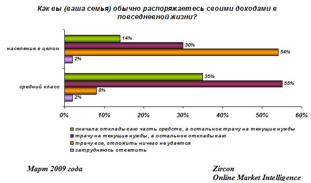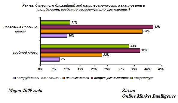 Средний класс сохраняет оптимизмВ марте 2009 года исследовательская группа ЦИРКОН при поддержке Московского центра Карнеги и при участии компании OnlineMarket Intelligence (OMI) провела всероссийский опрос общественного мнения по теме «Финансовая активность населения России». Опрос реализован посредством включения блока вопросов по теме исследования в общенациональный омнибус «КВАРТА». Объем выборочной совокупности омнибуса составил 1603 респондентов. Выборочная совокупность репрезентирует население РФ по параметрам пола, возраста, образования, типу населенного пункта и географии проживания. Впервые одновременно с общенациональным опросом населения по аналогичной анкете был реализован онлайн опрос участников Интернет-панели компании OMI Russia из числа представителей т.н. «передовых групп населения» или «среднего класса» (граждане с высоким доходом, высокой самооценкой социального статуса и материального положения, высоким уровнем Интернет-активности). Объем выборочной совокупности онлайн-панели составил 548 респондентов Исследование выявило серьезные отличия финансового поведения и финансовой активности представителей т.н. «передовых групп» населения по РФ в целом, что не удивительно, поскольку «передовую группу» составили респонденты с более высоким уровнем доходов. ![]() Текущие финансовые возможности представителей «передовых групп» определяют их заметно более высокий, в сравнении с населением в целом, потенциал сберегательной активности. Распоряжаясь своими доходами в повседневной жизни, около трети представителей «передовых групп» стараются сначала что-то отложить, а остальные деньги тратят на текущие нужды; среди населения России в целом такую же тактику выбирают только 14% опрошенных респондентов. Одновременно лишь 8% участников панели заявили, что тратят все деньги на текущие нужды и не могут ничего отложить, в то время как среди населения страны в целом ничего не откладывают, по их словам, более половины граждан. По-разному представители «среднего класса» и население России в целом оценивают свои перспективы финансового потенциала. Несмотря на финансово-экономический кризис, около трети представителей «передовых групп» уверены, что в ближайший год возможности накапливать и вкладывать свободные денежные средства возрастут, среди всего населения доля таких ответов втрое ниже. ![]() Понятно, что при повышенных доходах и социально активной позиции у представителей «среднего класса» существенно богаче инвестиционный опыт, чем у россиян в целом. В последние 5-6 лет две трети из них с тем или иным успехом вкладывали свои деньги в различные финансовые компании и банки, среди россиян в целом 75% заявили, что за тот же временной период никаких вкладов не делали. Различия в финансовом поведении представителей «передовых групп» и населения в целом обнаружены и при анализе такого параметра, как «склонность к риску». С одной стороны, при выборе коммерческого банка доля граждан, готовых рискнуть (вложить средства в банк, предлагающий высокие проценты, но имеющий низкую надежность), очень мала и одинакова и среди населения в целом, и среди представителей «среднего класса». В то же время участники онлайн панели почти вдвое чаще выражали склонность к выбору банка средней надежности и предлагающего средние проценты, чем населе
