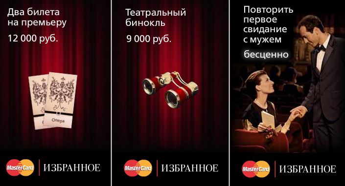 "Бесценный" "Мастеркард" недосчитался ста долларовРолик серии "Priceless" на ТВMastercard продолжает свою кампанию "Бесценно". С апреля в эфире телеканалов ротируется новый ТВ-спот "Опера". Бренд ведет агентство McCann Erickson. Итоговая фраза ролика - "Повторить первое свидание с мужем - бесценно" - предваряет слоган "Есть вещи, которые нельзя купить, для всего остального есть Gold и Platinum MasterCard". 30-секундный ролик ротируется на Первом канале, каналах Рен ТВ, Discovery, СТС, ТНТ и НТВ. Довольно забавно, что в японском "оперном" ролике MasterCard "Roman Days" билеты в оперу стоят 200 евро, тогда как в русской - 12 тысяч рублей. Даже по последнему курсу получается, что около трех с половиной тысяч рублей (200 евро это примерно 8500 рублей) при адаптации сценария из ролика куда-то делось. Текст японского ролика (по английскому варианту, выложенному на сайте Adoimagazine) переводится следующим образом: "Билеты в оперу - 200 евро Местный путеводитель - 12 евро Пара туфель на каблуке для особого вечера - 320 евро Приподнять завесу новой жизни - бесценно Есть вещи, которые нельзя купить, для всего остального есть MasterCard" Евгения Кузнецова, Sostav.ru |