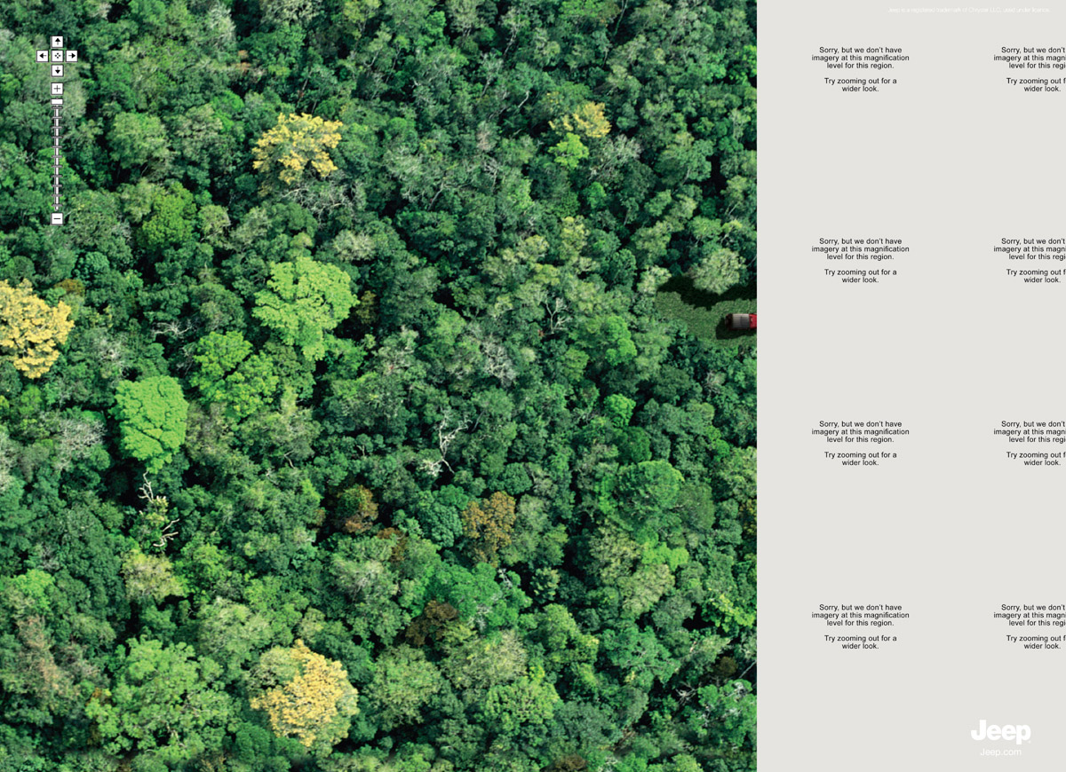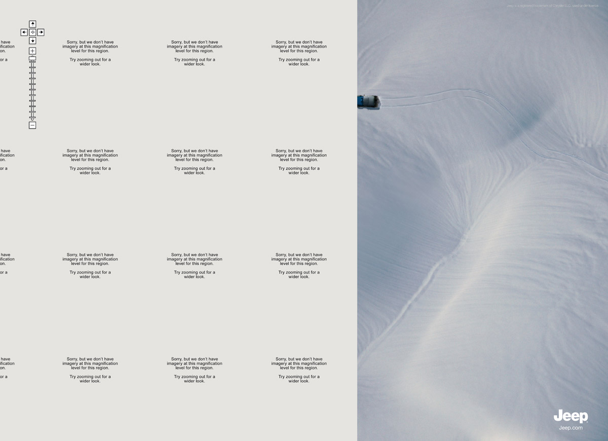 Jeep проедет по местам, неподвластным спутникуНа мировой рекламной арене всемирно известный и уже ставший нарицательным автомобильный бренд Jeep уже давно и успешно ведет сетевое агентство BBDO. Сегодня канадское представительство это агентства, которое уже однажды рассказывало ЦА про обожравшегося мишку, демонстрирует места, которые неподвластны даже спутникам, но куда с легкостью доберется Jeep. Агентство: BBDO Canada, Канада |