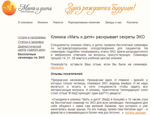 Образовательная акция вместо обычной рекламыМедицинская клиника «Мать и дитя» совместно с агентством Market Interactive (ГК Market Group) в марте 2009 года провели необычную пиар-кампанию. Вместо того, чтобы прямым образом рекламировать услуги искусственного оплодотворения (ЭКО), в Сети была проведена образовательная акция с использованием инструментов контекстной и баннерной рекламы, работы с тематическими блогами и форумами и системы обратной связи с респондентами.