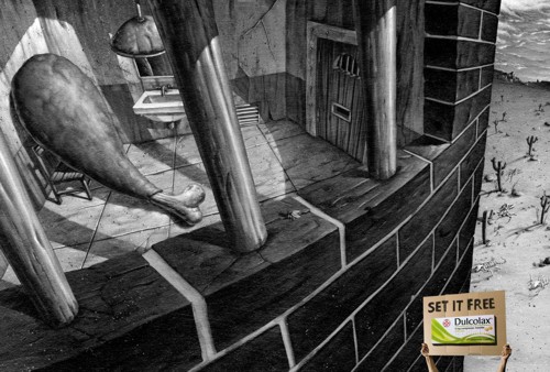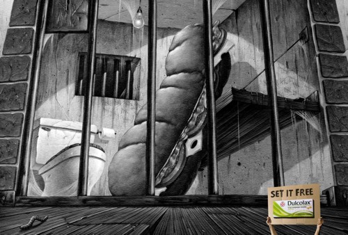 Слабительное Dulcolax освободит еду из тюрьмыDulcolax (Дульколакс) – лекарственное средство от французской компании Boehringer Ingelheim France, обладающее слабительным действием, которому и посвящена эта рекламная кампания, созданная итальянским агентством Saatchi&Saatchi. Креаторы решили показать на принтах, в каких именно случаях следует применять Dulcolax: он поможет, если, например, еда оказалась запертой в человеческом теле словно в тюрьме. Слоган: «Освободи ее»