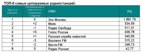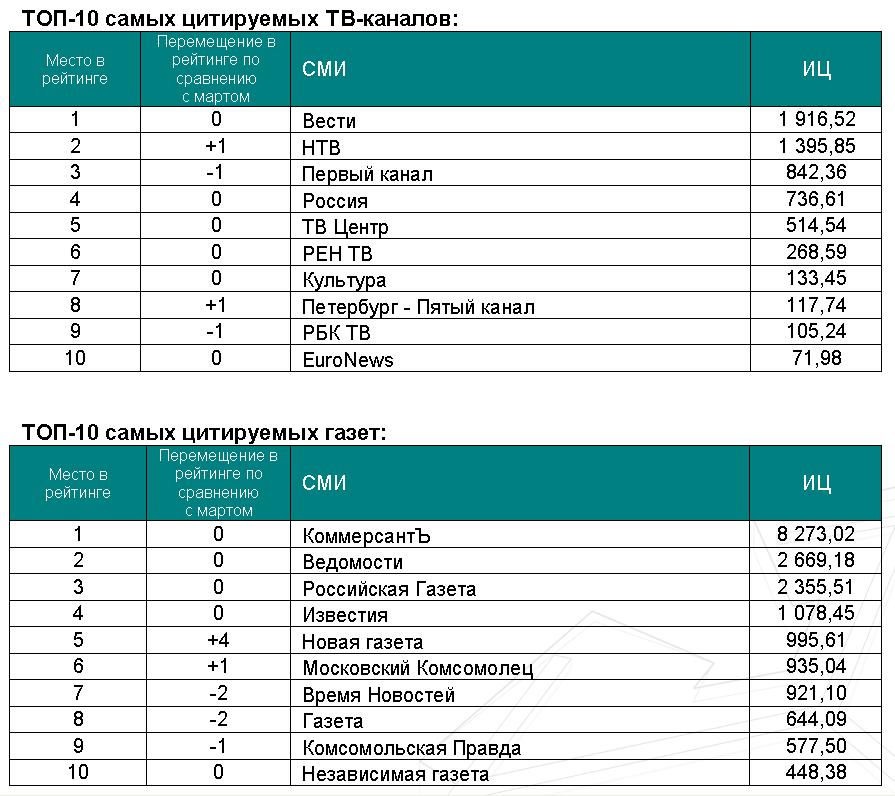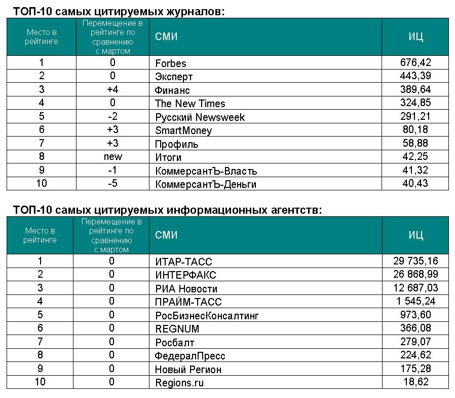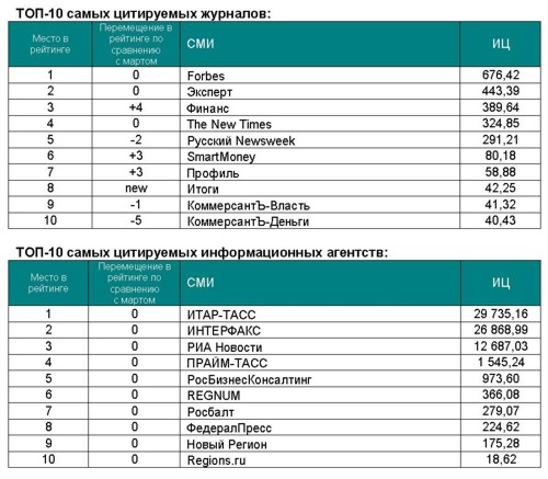 "Финанс" и "Новая газета" шагнули впередЦитируемость двух изданий в апреле значительно возрослаСогласно очередному рейтингу "Медиалогии", в апреле журнал "Финанс" и "Новую газету" стали цитировать значительно чаще, чем в предыдущем месяце. Удивительно, что в прошлом рейтинге именно эти издания понесли наибольшие потери в своих категориях. На величину "Индекса цитируемости" (ИЦ) влияет несколько показателей, в том числе: количество ссылок на источник в сообщениях СМИ и заметность этих сообщений. При этом самоцитирование не учитывается. Заметность сообщения, например в печатных изданиях, зависит от влиятельности СМИ, номера полосы издания, размера публикации, наличия и размера иллюстраций, экспрессивности заголовка и других параметров. |