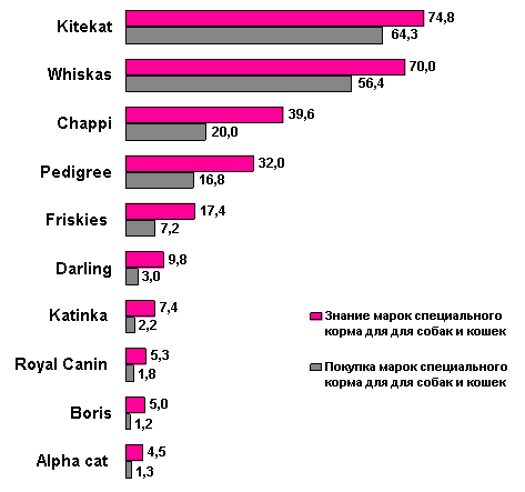 Анализируя степень знания и покупки марок специального корма для кошек и собак, можно сделать вывод о том, что наиболее популярными марками корма по знанию и покупки среди покупателей данного продукта являются: "Kitekat" - данную марку знают 74,8%, покупают 64,3%. На втором месте по знанию и покупки находится "Whiskas" - его знают 70%, покупают 56,4%. Третье место занимает марка "Chappi", уровень знания данной марки - 39,6%, покупки - 20% (см. Диаграмму 2). Диаграмма 2: Наиболее известные и потребляемые марки специального корма для животных: TOP 10 В рамках проекта "Media Marketing Index" можно определить не только наиболее популярные марки тех или иных товарных категорий, но и отношение респондентов к такому явлению, как реклама, которая является неотъемлемой частью нашей жизни. В 2008 году среди респондентов, которые содержат домашних животных, можно отметить, что как положительное, так и негативное отношение к рекламе примерно разделились в равных долях (см. Диаграмму 3), но тем неменее, наибольшее доверие вызывает именно телевизионная реклама (32,2%). Диаграмма 3: Отношение к рекламе Большое количество рекламы в современном мире позволяет владельцам домашних животных выбрать для своих питомцев наиболее приемлемые и полезные корма. А производители в свою очередь выводят на рынок более усовершенствованные виды и марки кормов, затрачивая на их рекламу большое количество средств. Именно поэтому значительную часть издержек составляет именно реклама. Так, например, в 2008 году на рекламу корма для кошек "Whiskas" было затрачено 4 134 105 долларов США (см. Таблицу 2). Таблица 2: Распределение рекламного бюджета по видам СМИ2