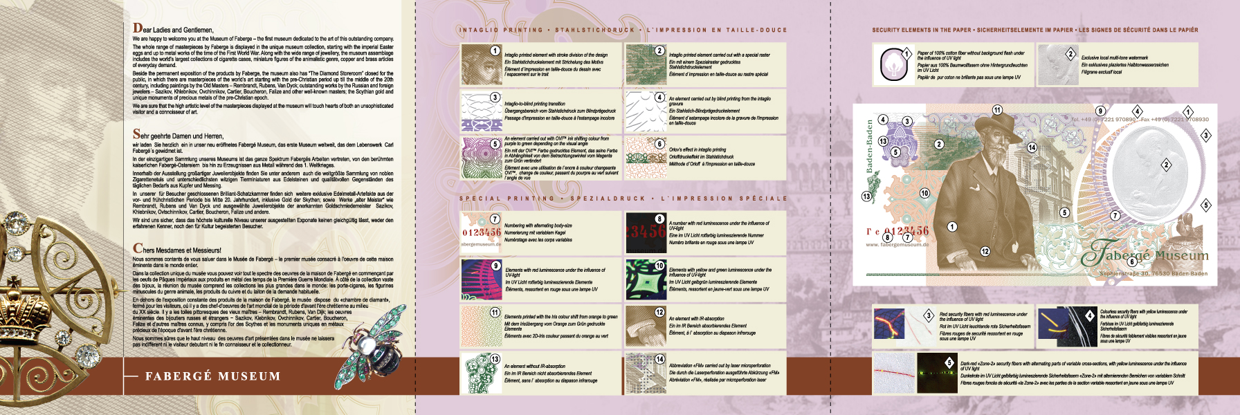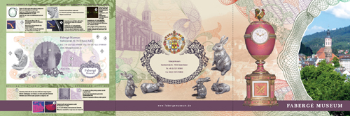 "Развитие" приглашает в музей ФабержеПромышленно-консалтинговая группа "Развитие" разработала концепцию, осуществила дизайн и производство буклетов первого в мире музея Фаберже в Баден-Бадене.9 мая 2009 года в Германии в Баден-Бадене открылся первый в мире музей Фаберже, созданный на средства российского коллекционера Александра Иванова. В музее вниманию публики представлено более 3000 экпонатов, общей стоимостью около 1,5 миллиардов долларов. Промышленно-консалтинговой группе "Развитие" было доверено создание презентационной продукции музея, в частности, двух видов буклетов, отвечающих уровню музея искусства мирового класса. Совместно с одним из госпредприятий была разработана концепция материалов: в её основу легла идея придать входному билету (равно как и буклетам) ценность, соответствующую высокому статусу самого музея и экспонатов, в нем представленных. Для этого билет в музей был выполнен с применением уникальных российских защитных разработок и технологий, используемых при печати денежных банкнот. Ценность входного билета (стоимость которого, к слову, составит ориентировочно 20 евро) полностью отражена в буклетах, дизайн и производство которых были выполнены ПКГ "Развитие". |