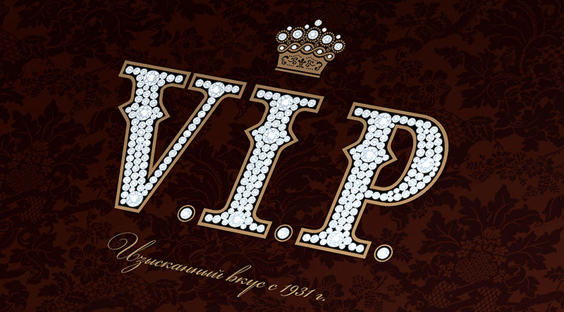 Студия Акима Мельника по заказу компании "Коммунарка" разработала дизайн упаковки шоколадных конфет V.I.P. Перед студией была поставлена задача создать графическое начертание названия, оригинальный орнамент и собственно сам дизайн упаковки объемом 950 грамм.