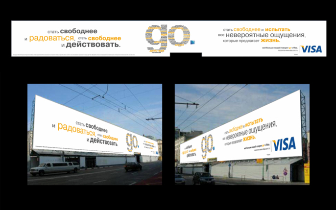 GO в "Домодедово"Нестандартная реклама Visa в московском аэропортеКак писал Sostav.ru, в марте в эфире появились первые ролики новой рекламной кампании Visa "Все больше людей говорят GO с Visa". По словам Андрея Михальченко, директора группы по работе с клиентами TBWAMOSCOW, перед агентством стояла задача одновременно и остаться в рамках глобальной концепции, и создать продукт, отражающий особенности локального, российского, рынка. "Мы довольно долго думали над тем, надо ли переводить слово "GO", используя один из русских синонимов - 'действуй', 'двигайся'. Но в рамках глобальной коммуникационной платформы бренда 'GO' - это не просто слово, не просто две буквы в рекламной кампании. Это слово - интернациональный символ Visa. Это идея, мировоззрение бренда - понимание того, что люди хотят двигаться вперед. Независимо от окружающих экономических условий, Visa помогает выбрать удобный и безопасный путь. Идея, которая должна быть понятна всем в мире. Наверное, действительно в России не многие говорят 'о, Visa, надо GO', но для многих карточка Visa в кармане - это дополнительный фактор уверенности в своих возможностях: будь то желание путешествовать или просто провести выходной с детьми - Visa помогает чувствовать, что это возможно. Поэтому люди действительно реализуют свои желания. Говорят "пора действовать, надо это сделать". И действуют, делают. С Visa. Рекламная кампания несет именно эту идею. И, благодаря глобальной коммуникации, она узнаваема и понятна во всем мире".