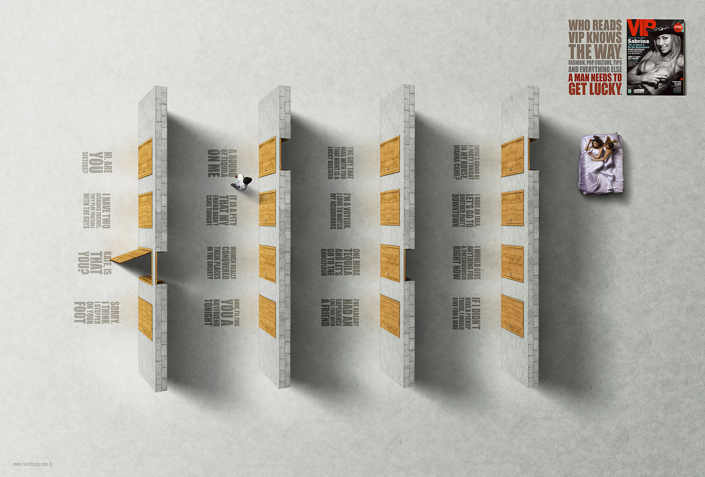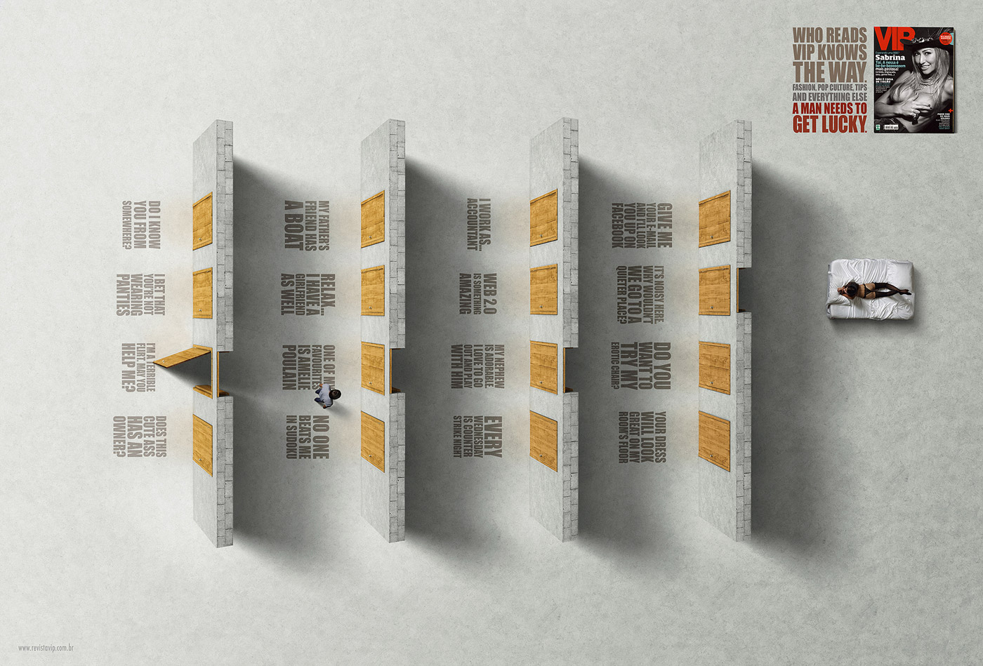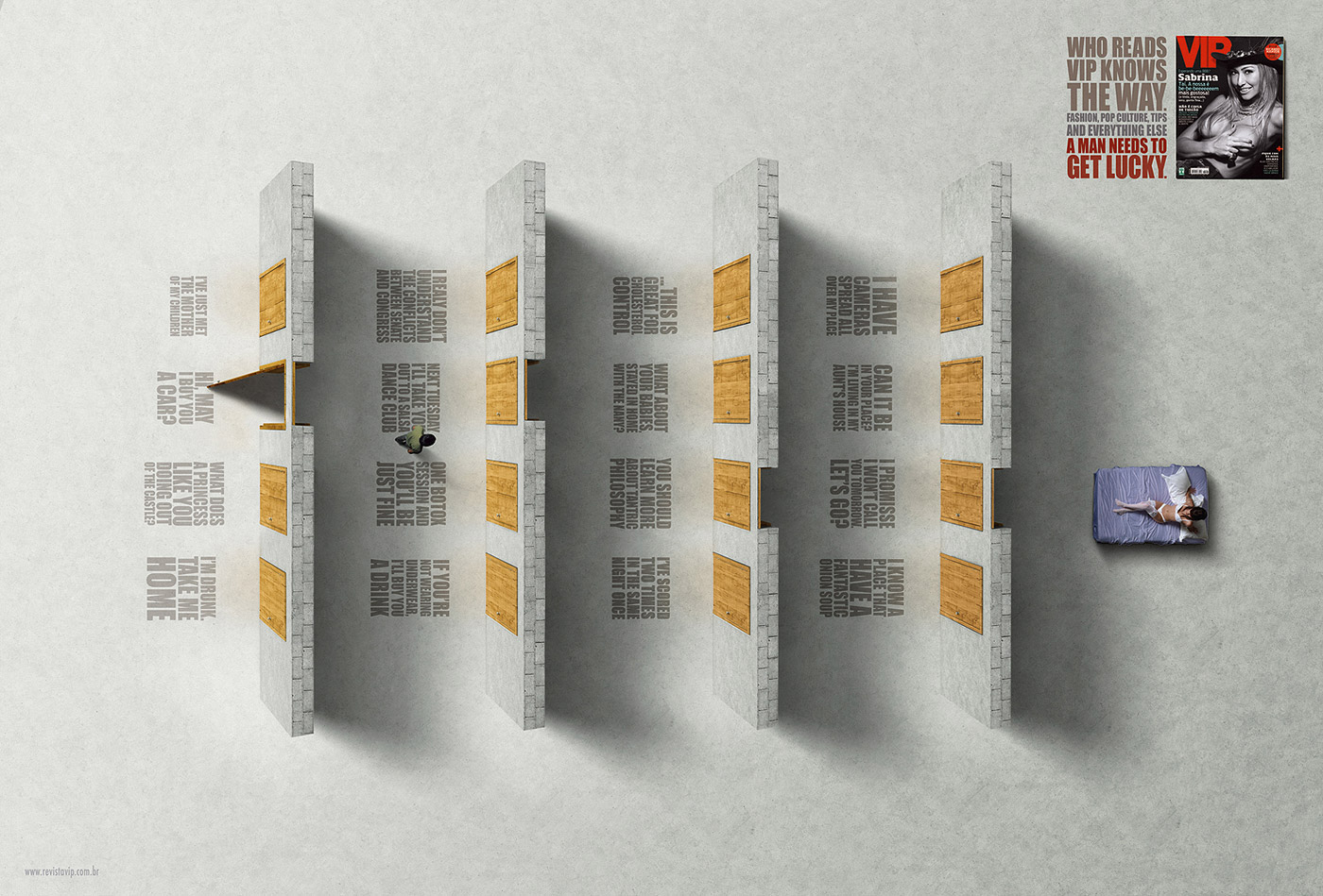 Журнал VIP покажет путь в постель женщиныКак рассказывает бразильское агентство MatosGrey, подготовившее эту рекламную кампанию, журнал для мужчин VIP не только культурно образует и привьет чувство стиля любому представителю сильного пола, но и покажет дорогу в кровати шикарных женщин. Чтобы визуализировать этот мессадж, креаторы создали своего рода квест, в конце которого мужчину ждет в постели прекрасная дама.Слоган: "Тот, кто читает VIP, знает дорогу. Мода, поп-культура, подсказки и все остальное, что нужно мужчинам, чтобы стать удачливыми." Агентство: MatosGrey, Сан-Паулу, Бразилия Творческий директор: Silvio Matos, Guy Costa, Leandro Castilho Арт-директор: Andre Sallowicz Копирайтер: Filipe Medici Иллюстратор: Burti HD Фотограф: Marcio Sallowicz |