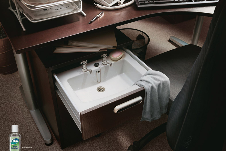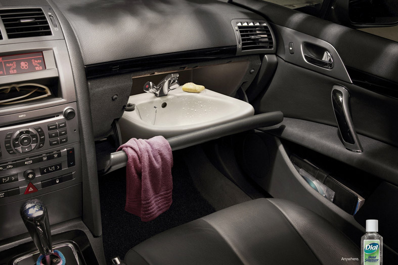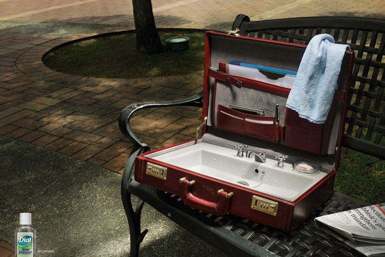 Антисептик Dial расставил раковины вездеОгромное преимущество современных дезинфицирующих средств для рук в том, что они не только легки в применении и занимают мало места, но и в том, что их можно использовать где угодно. Именно это и попытались показать арабские креаторы из агентства TBWA\RAAD Dubai, создавая рекламную кампанию для антисептика Dial. Специалисты решили проиллюстрировать слоган, разместив раковины в чемодане, ящике стола и бардачке автомобиля. Отметим, что данное преимущество антисептиков рекламные агентства освещают впервые. Обычно рекламные кампании дезинфицирующих средств основываются на количестве невидимой грязи на руках человека. Именно так поступили креаторы из EURO RSCG Kuala Lumpur и EURO RSCG Sydney, разработав рекламные кампании для антисептического геля Dettol. Ну а австралийцы из JWT Sydney вообще сравнили действие антисептика Purell с защитными перчатками. Слоган: «Везде.» Агентство: TBWA\RAAD Dubai, ОАЭ |